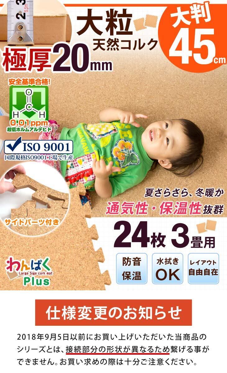 ◆備考◆ ※コルクは天然素材のため性質上粉が生じたり欠けたりする場合がございます。その場合、 掃除機で吸い取るなどのお手入れが必要となりますので、予めご了承ください。 ※マットの上での暖房器具の使用はおやめください。 ※汚れた場合は固く絞った雑巾で拭き取ってください。水分が隙間に入り込んだ場合はカビ発生の原因となる場合がありますので、定期的にマットを剥がして掃除してください。匂いが気になる場合は、風通しの良いところで干してください。 ※湿度の変化が大きい場所でのご使用は、反りやたわみが発生する場合がございます。 ※PE素材の特性上、使用するうちに負荷がかかる部分に多少のへたりが生じる場合がございます。そのため、既に使用しているマットに新しいマットを繋げて使用する際、上手く繋がらない場合もございますので、予めご了承ください。 ※2018年9月にジョイント部分を仕様変更しました。2018年9月5日以前にお買い上げいただいた当商品とは、接続部分の形状が異なるためジョイントさせることができません。お買い求めの際は十分ご注意ください。