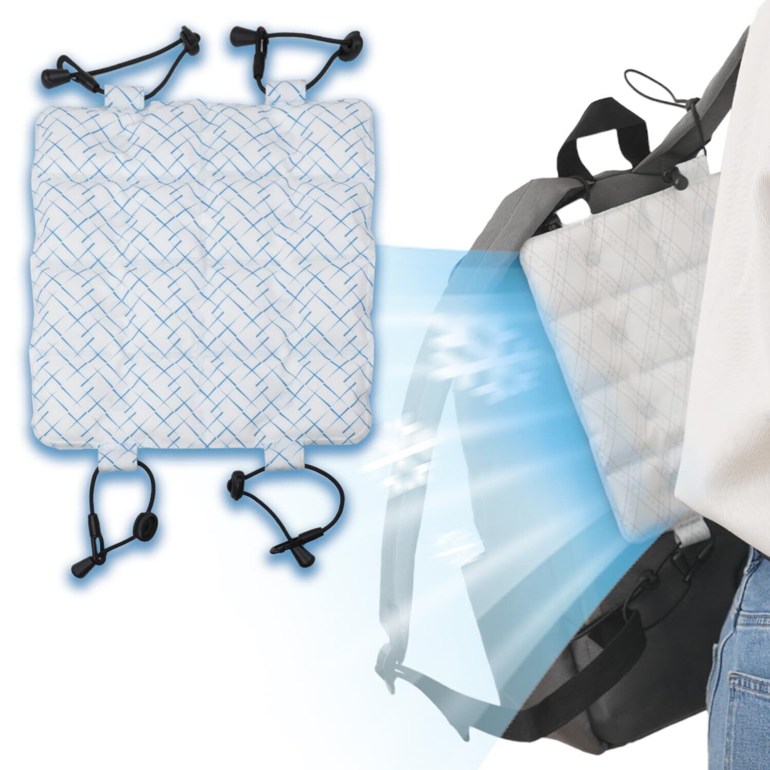 ② 【 背負える・吊り下げ可能な多機能設計】 四隅のループでリュックやベビーカーに簡単装着!背中にフィットするサイズ感で、外出中の熱中症対策にも便利。「背負える冷感マット」として、持ち歩ける快適さを実現