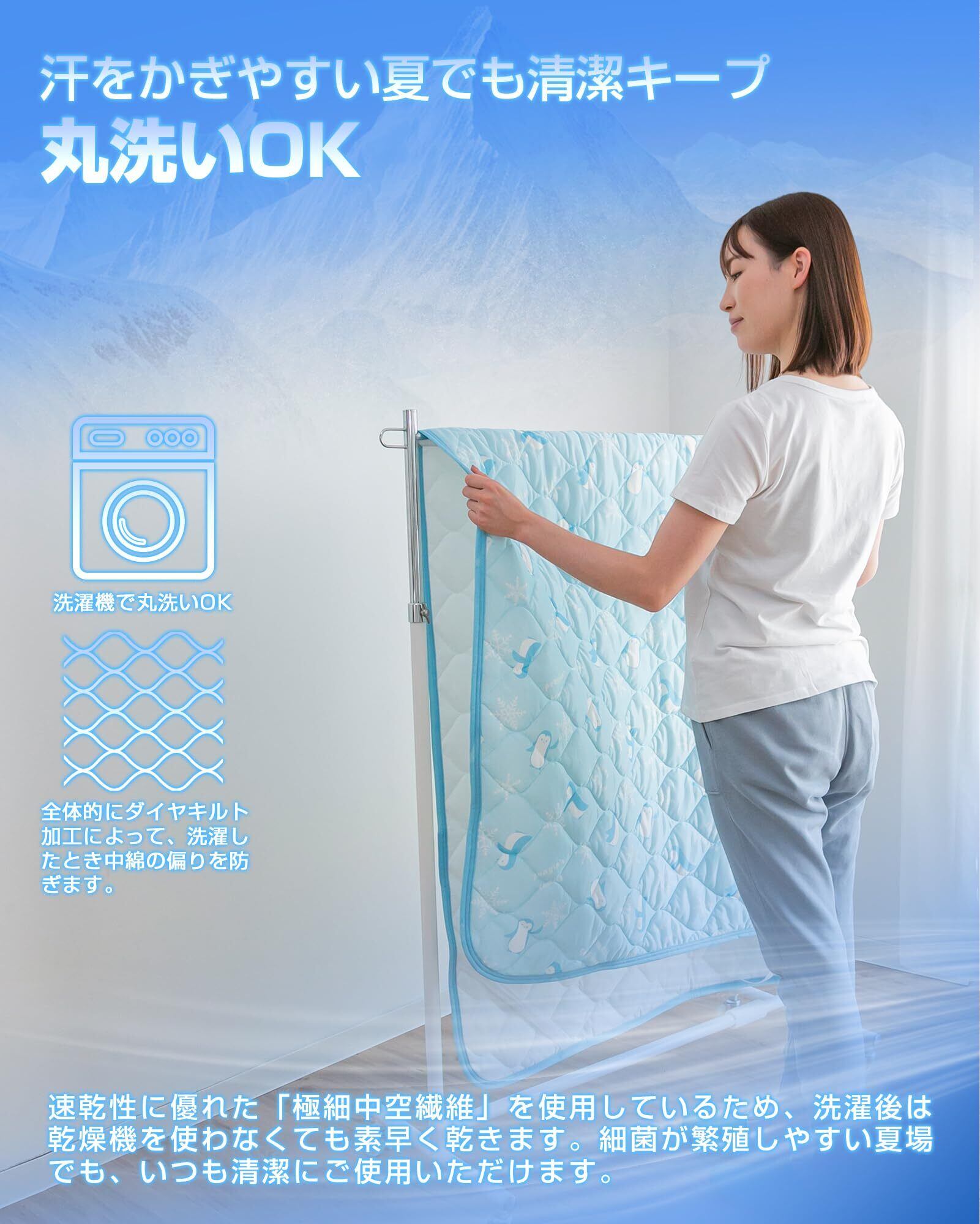 【ひんやりした肌触り】Q-MAX0.46熱伝導性の高い素材を使用することで、触った瞬間ひんやりとした心地よさがあります。冷房や扇風機などを併用すると、さらにひんやりと気持ちよくお使いいただけます。