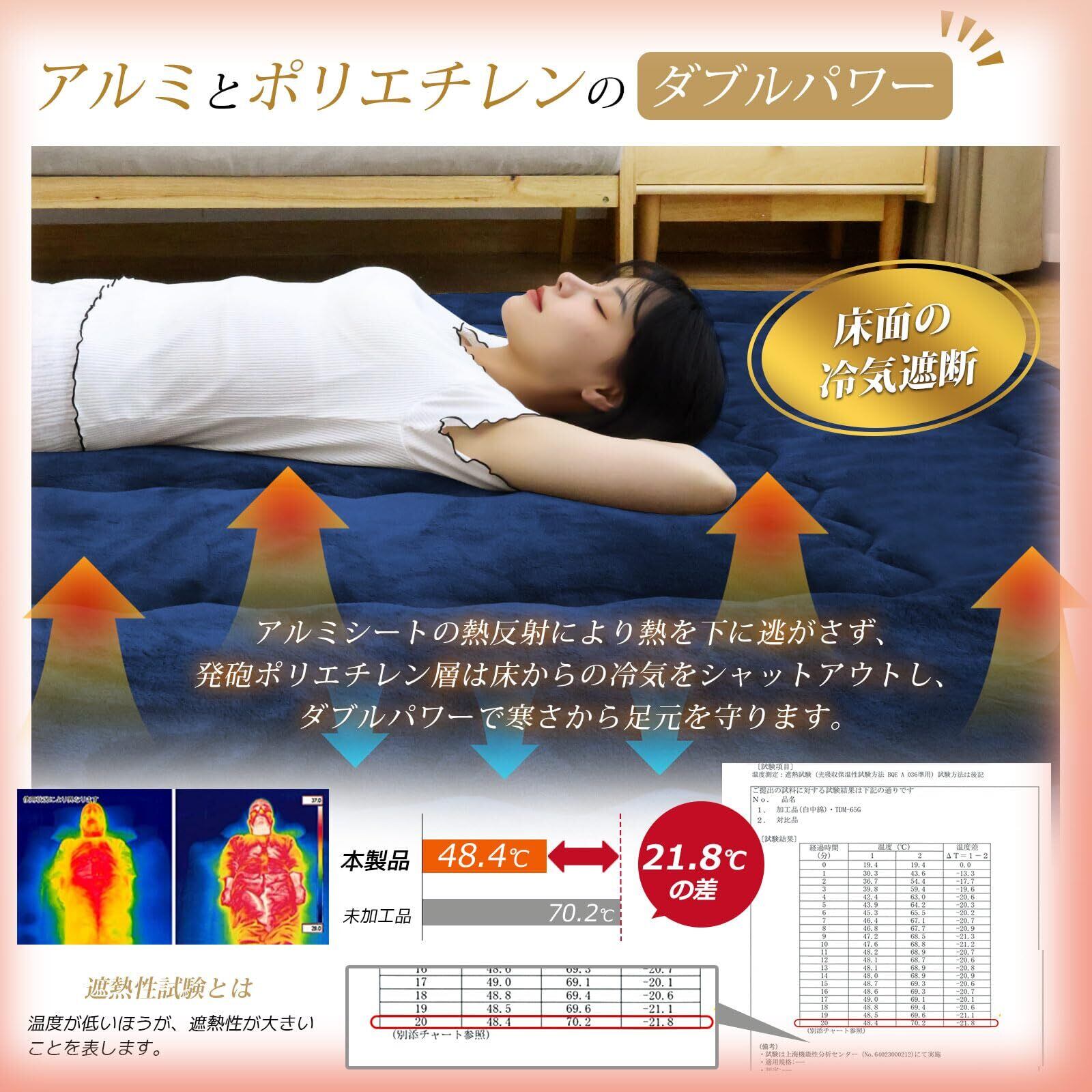 【ダブル冷気遮断・保温力倍増】ポリエチレンシート+アルミシートの組み合わせ。アルミ断熱シートとは、アルミシートに含まれた空気の層により熱の伝達を遅らせる断熱材のことです。アルミシートの熱反射により熱を下に逃がさず、ポリエチレン層は床からの冷気をシャットアウトし、ダブルパワーで足元からの冷気をストップ。節電対策!経済的!