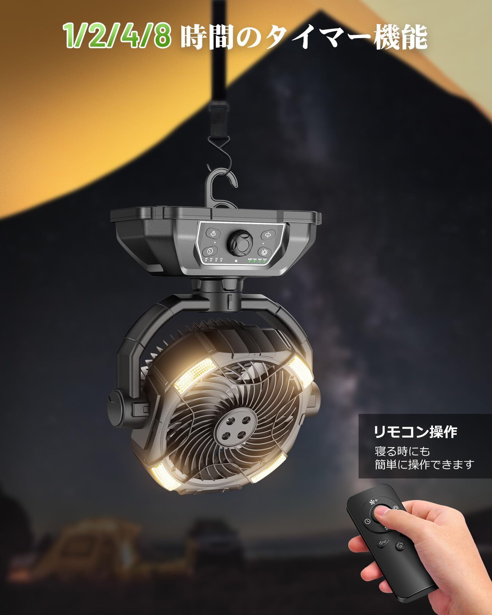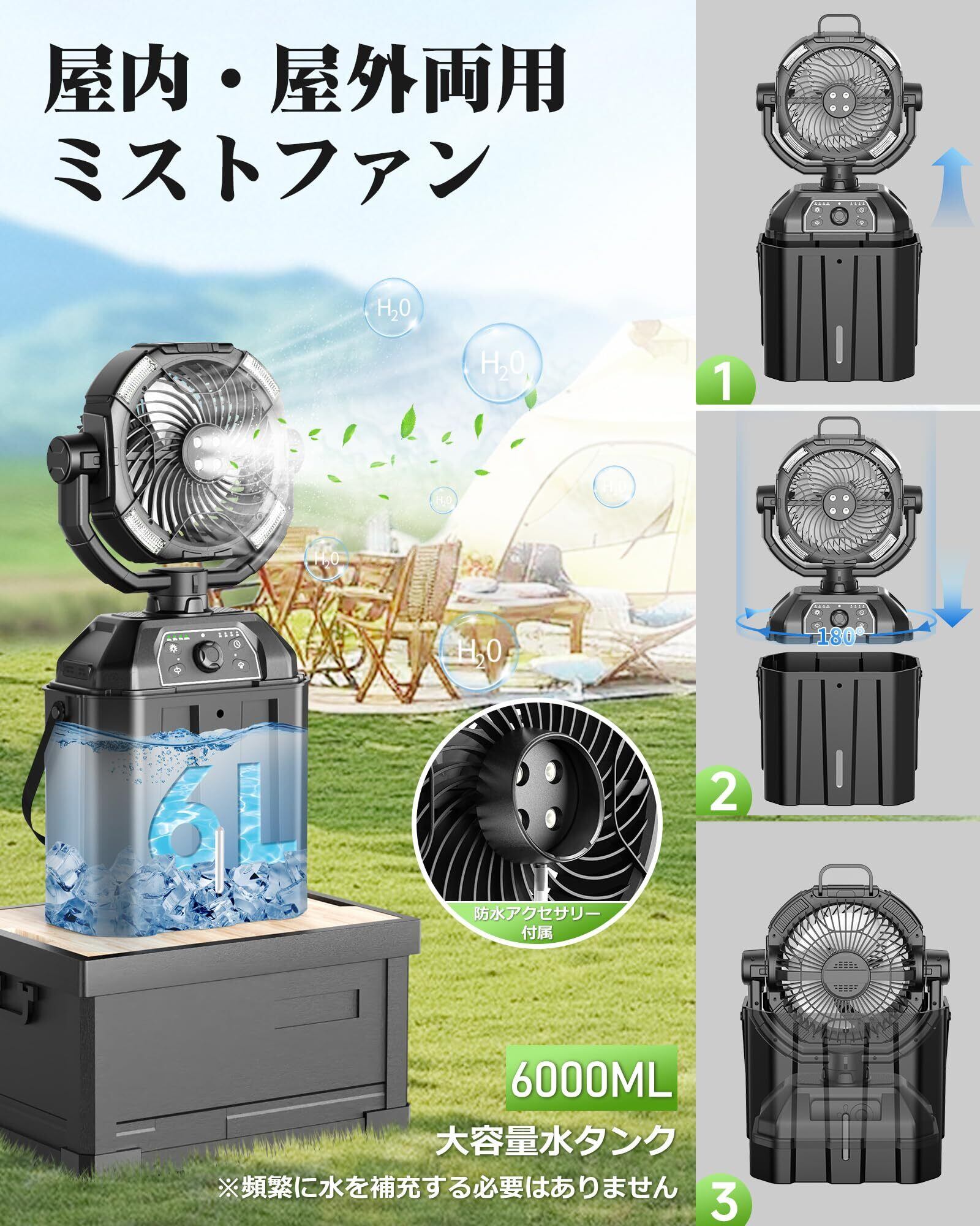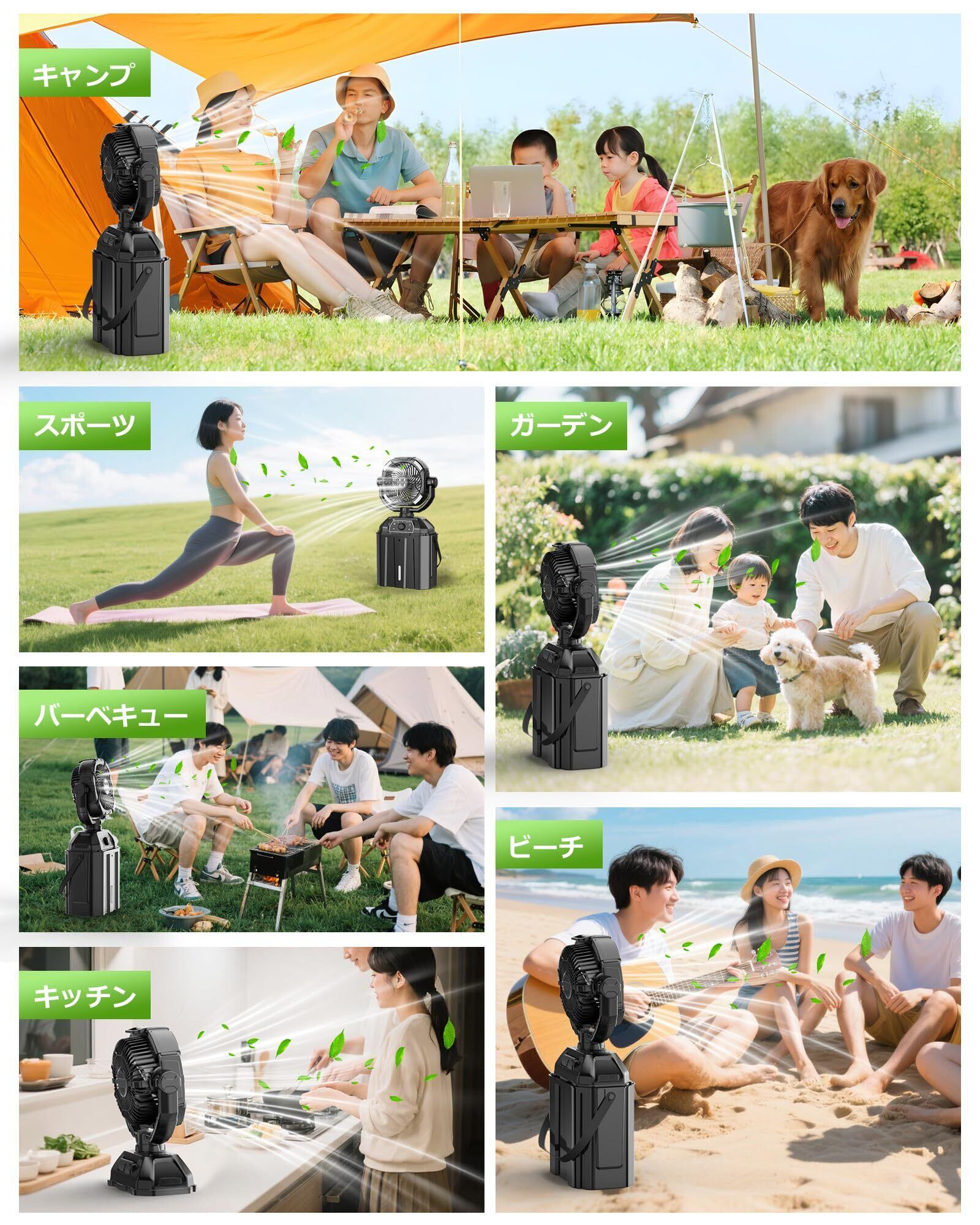 【 限定ブランド】キャンプ 扇風機 ミストファン 自動首振り 超強風 最大55時間連続使用 風量無段階調節 充電式 リモコン付き タイマー機能 低騒音 多機能 吊り下げ サーキュレーター 卓上 扇風機 防災 キャンプ用品 テントマット コンパクト 持ち運び便利 屋内/アウトドア両用 熱中症対策 日本語取説付 (ブラック)