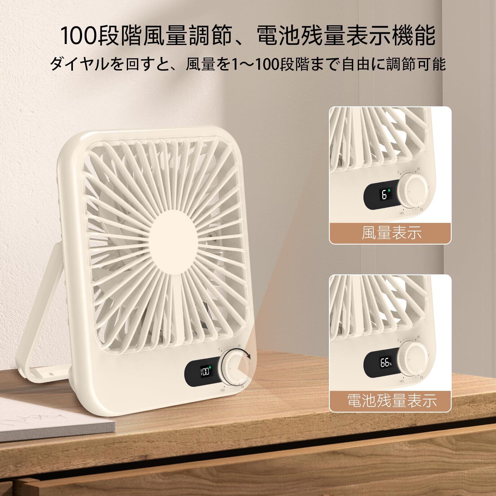 【無段階風量調節・LEDディスプレイ】この小型扇風機は一つのダイヤルだけで、簡単に風量を調節できます、ダイヤルを回すだけで、風量が0から100段階まで調節可能。ファンにはLEDディスプレイが装備され、風量モードやバッテリー残量を1%単位で表示してくれる。