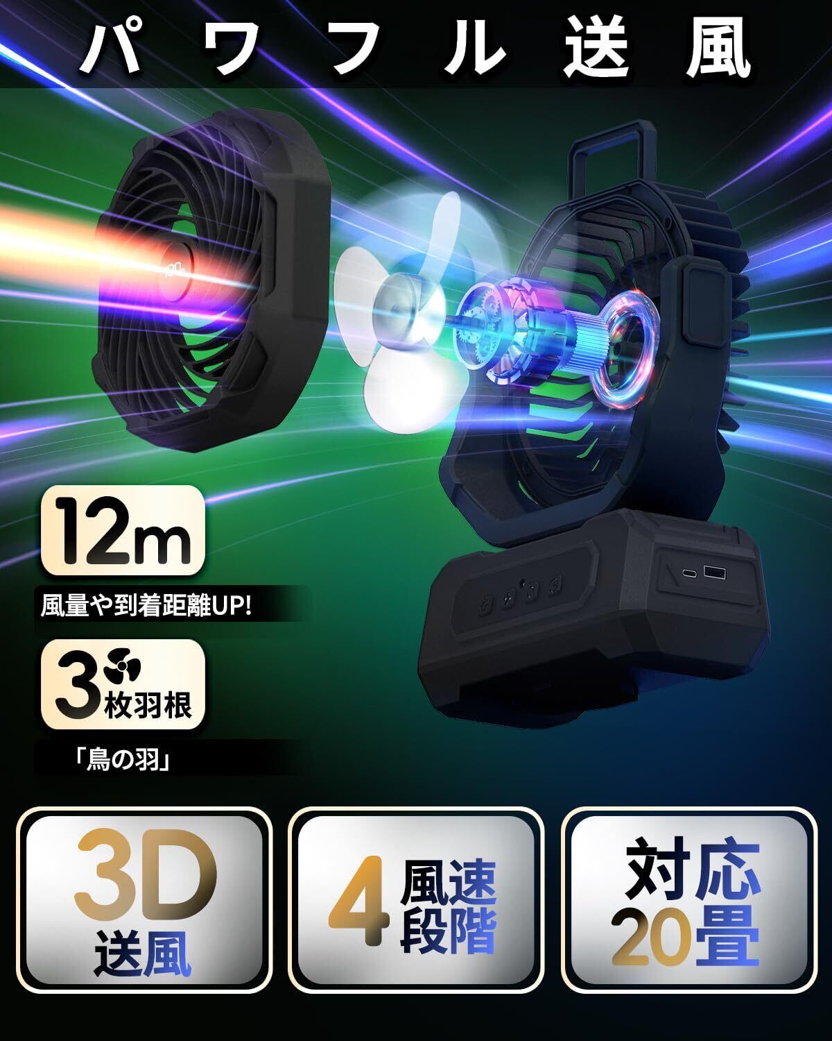 【「鳥羽型鳥羽型ブレード」&風量4段階調節&自動首振り機能 】2025年Koramaku 【鳥羽型キャンプ扇風機 完全進化版】自然の呼吸を再現!鳥羽型ブレード採用の特殊3枚羽根(従来比風圧40%向上)が風速4m/sを実現し、最大到達距離12メートル。弱風・中風・強風・超強風の4段階風量モードで、気温が高い真夏でも適度に涼むことができる。キャンプ場を一瞬で涼やかにする首振り機能搭載:左右120°自動+上下270°手動で幅広い風量に対応。