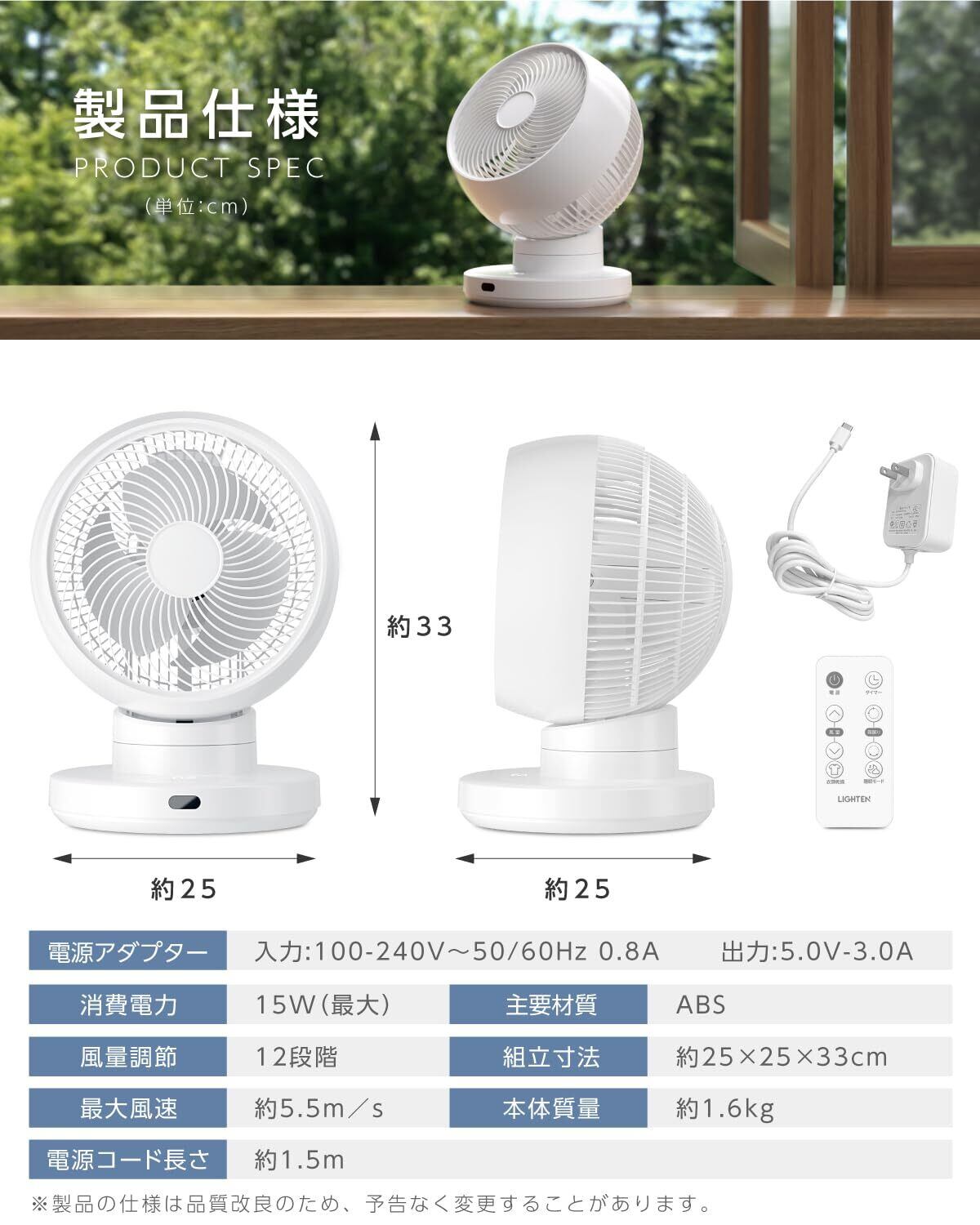 ✨【商品仕様&信頼の品質】サイズは約25×23.5×33cm、重量:約1.6kg、風量調整:12段階段階、消費電力:15W、電源(アダプター付き):100V~240V (50/60Hz) リモコンや日本語取扱説明書(書付き)が付属します。※初期不良・初期破損からご使用中まで、ご不明な点がございましたら、「注文履歴」→「出品者に連絡する」より、迅速にサポート致します。