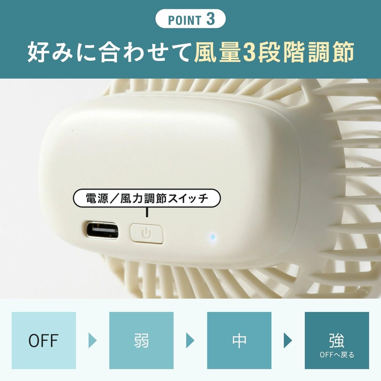 機能:風量3段階切替(弱、中、強)