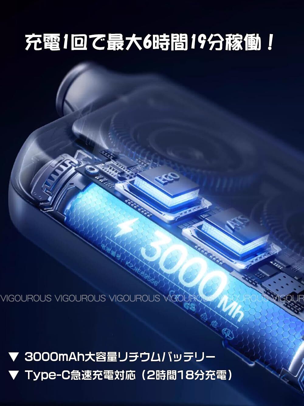 【3000mAh長寿命バッテリー】 USB充電可能なリチウムイオンバッテリーを搭載。充電時間:2時間18分。使用時間(満充電時):弱モード(1速):最大6時間19分連続稼働、中モード(2速):最大2時間55分連続稼働、強モード(3速):最大1時間58分連続稼働。