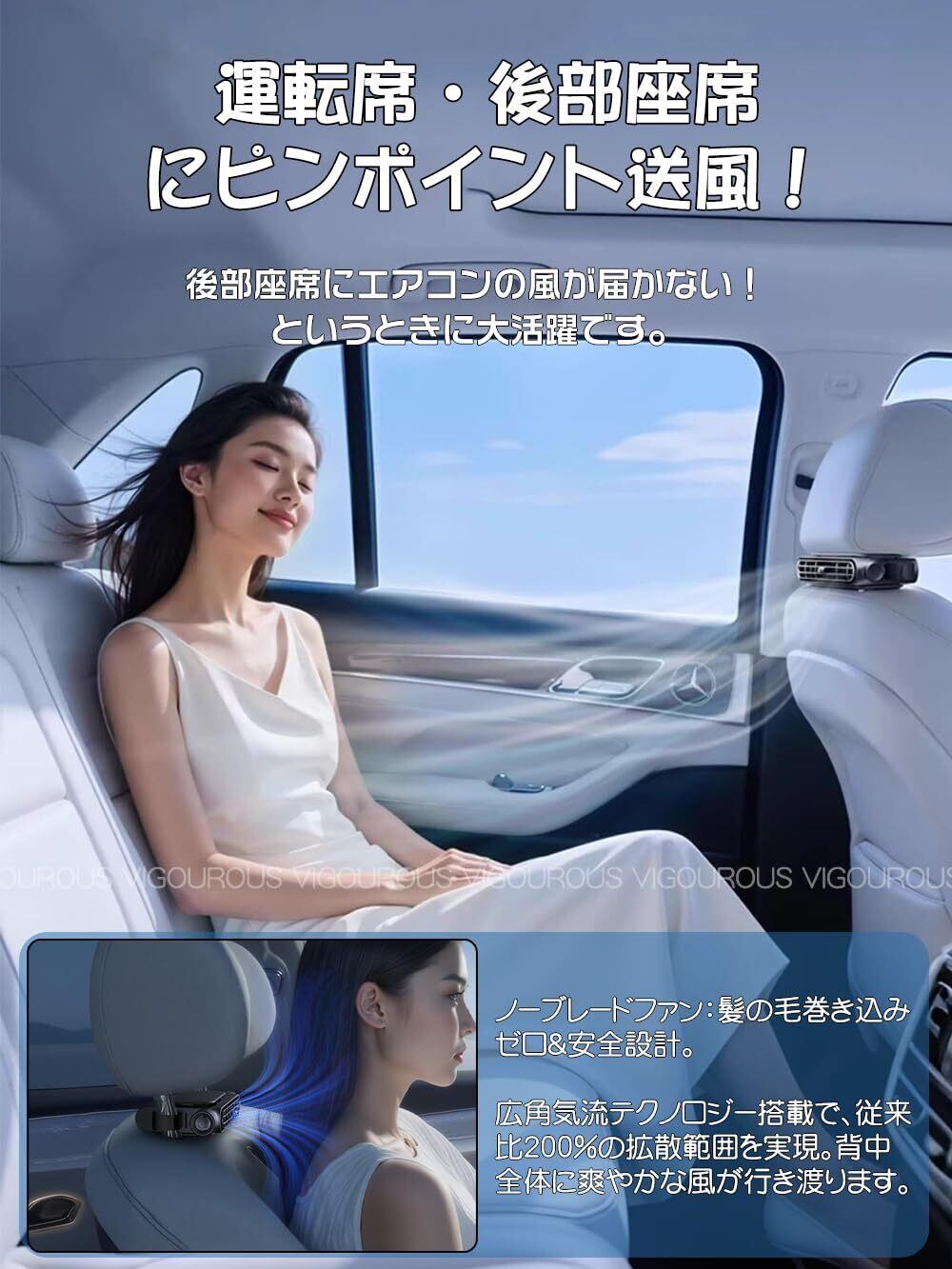 【3000mAh大容量バッテリー内蔵!車載ファン新登場】VIGOUROUS 車載扇風機 座席ファン ヘッドレスト 強力扇風機 後部座席 ダブルターボ強風 USB充電式 3段階風量調節 コンパクト設計 熱中症対策 夏対策 車中泊対策 空気循環 取り付け簡単 カー用品 (ホワイト)