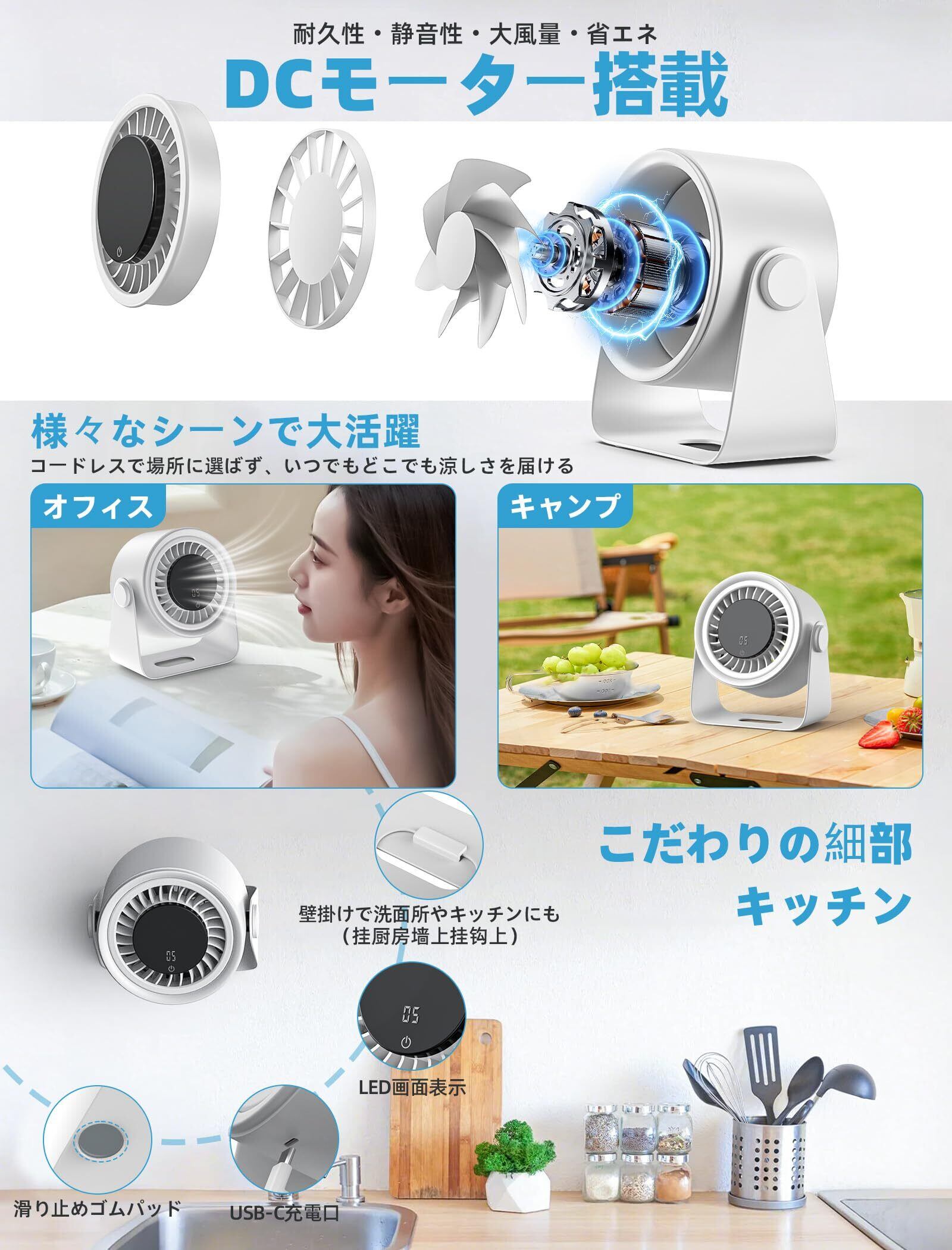 【台2役卓上扇風機】コンパクトながら高性能なこのは、卓上扇風機パワフルな風量と静音設計を兼ね備えています。滑り止め付きの台座で、デスクトップでも使用できます。ファンの底面にはフック穴があり、キッチンツールのフックなど、どこにでも吊り下げることができます。また、充電式扇風機は天井扇風機としてテントやタープに吊るすことができるので、さまざまな場所で使用できます。