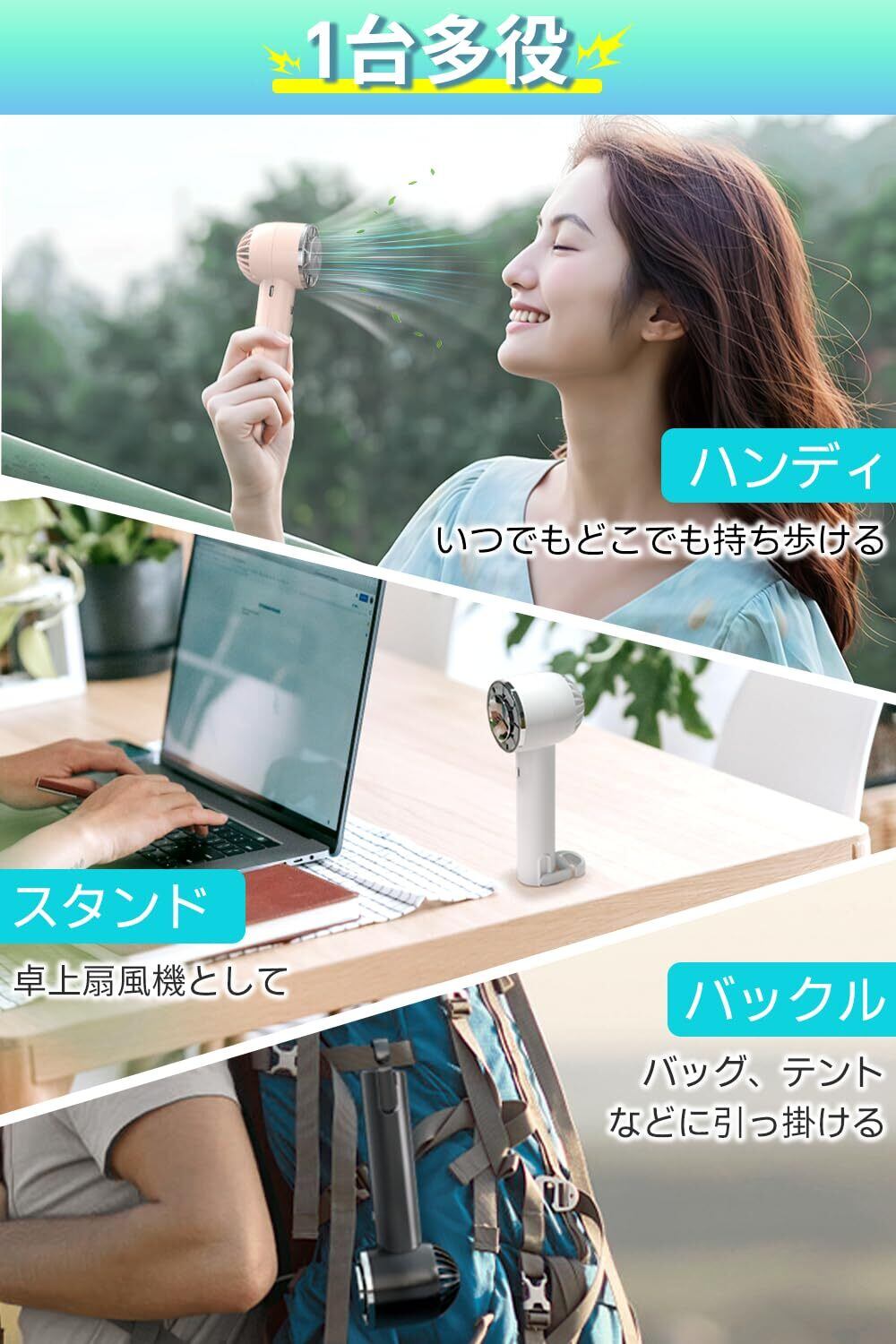 【カラフルデザイン×多機能バッグアイテム】ホワイト/ピンク/ブラックのトレンドカラーをラインナップ! ギフトにも最適な洗練されたデザイン。さらに驚きはその多用途性!①手持ち扇風機②卓上スタンド③バックル付きハンガーの3WAY利用可能。テントやバッグに引っ掛けて持ち運び、必要な時にすぐ使えるコンビネーションデザイン。USB-C充電式で、パソコンやモバイルバッテリーでも充電可能なので、海外旅行にも安心!