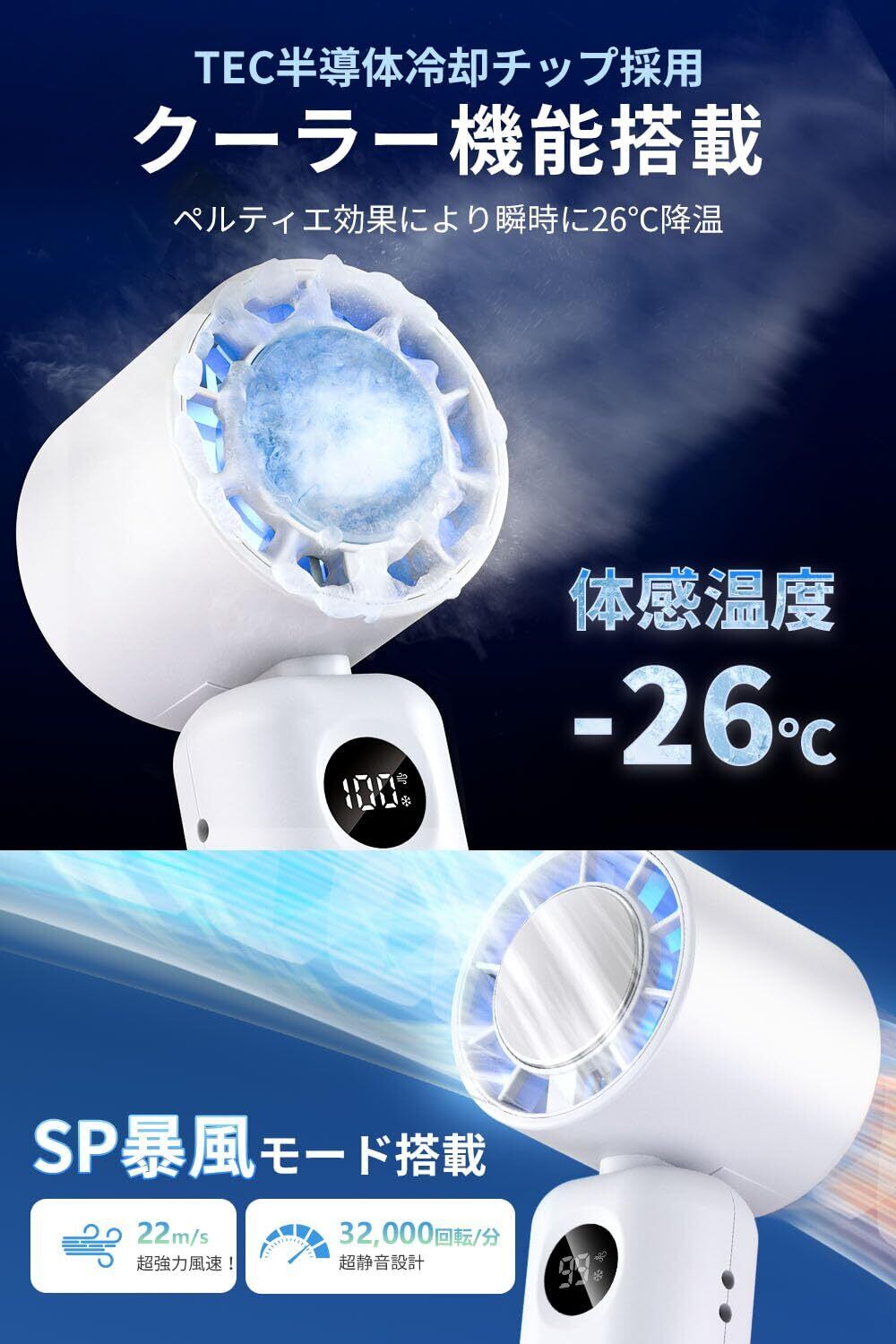 ハンディファン 冷却プレート 【SP暴風モード付き & -26℃瞬間冷却】 ペルチェ 携帯扇風機 手持ち 扇風機 ハンディ 軽量 小型 100段階風量 強化7枚羽根 強力 静音 6800mAh大容量 急速充電 Type-C充電式 4WAY (首掛け/卓上/手持ち/腰掛け) ファン 熱中症対策 通勤 通学 オフィス アウトドアなどに適用 (ホワイト)