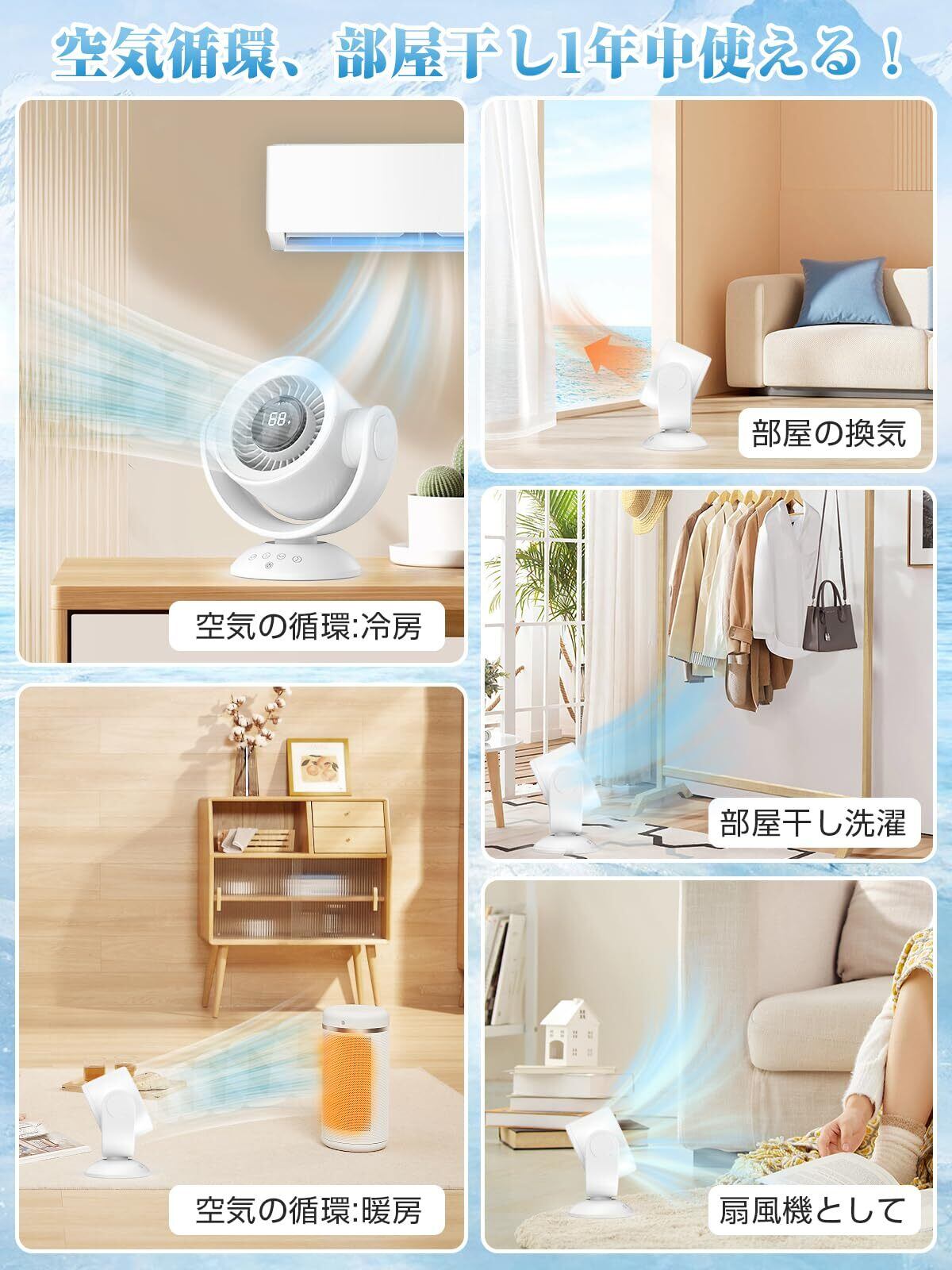【全年用サーキュレーター】エアコンとの併用で夏の室温バランスを整え、冷気を足元から部屋全体へ循環させ、エネルギーと電気を節約。除湿機との組み合わせで春の湿度調整、梅雨時の衣類乾燥や換気、加湿器との併用で秋の湿度均一化、ヒーターとの連携で冬の暖気流速アップ。エアコンとの併用により、より一層の省エネ効果が期待できます。狭いスペースでも、広い部屋でも、この扇風機はあなたの夏を快適にサポートします。