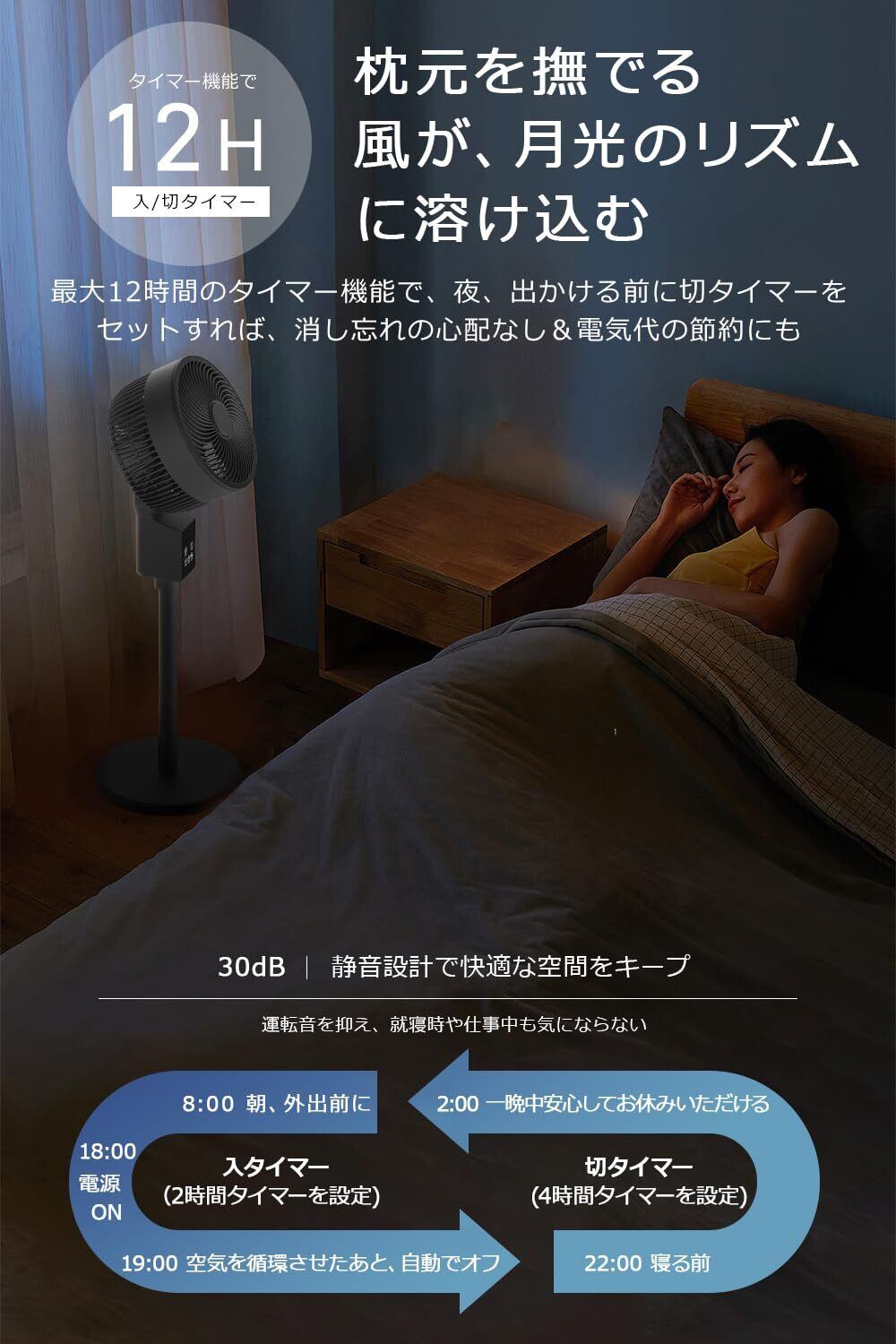 【静音運転&12H入/切タイマーで、生活リズムにぴったり】12時間の入切タイマー機能を搭載しており、ライフスタイルに合わせて運転時間を自由に設定可能。就寝前に自動オフを予約したり、朝に合わせてオンにしたりと、無駄な運転を防ぎながら賢く使えます。運転音はわずか30dBの超静音設計で、ささやき声ほどの静かさ。深夜や赤ちゃんのいるお部屋、書斎などでも気にならず、快適な空気循環を実現します。