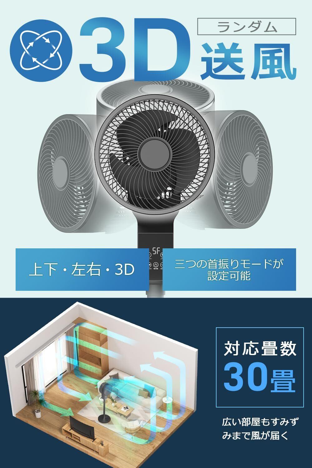 サーキュレーター 扇風機 【上下左右自動首振り&AIモード&マイナスイオン】 リビング扇風機 DCモーター 30畳 パワフル送風 暴風モード 12段階風量&4モード 睡眠モード せんぷうき 静音 アロマ対応 12時間入/切タイマー リビング/卓上扇風機 節電対策 リモコン付 暑さ対策 熱中症対策 オールシーズン 梅雨除湿/冷房/暖房/空気循環