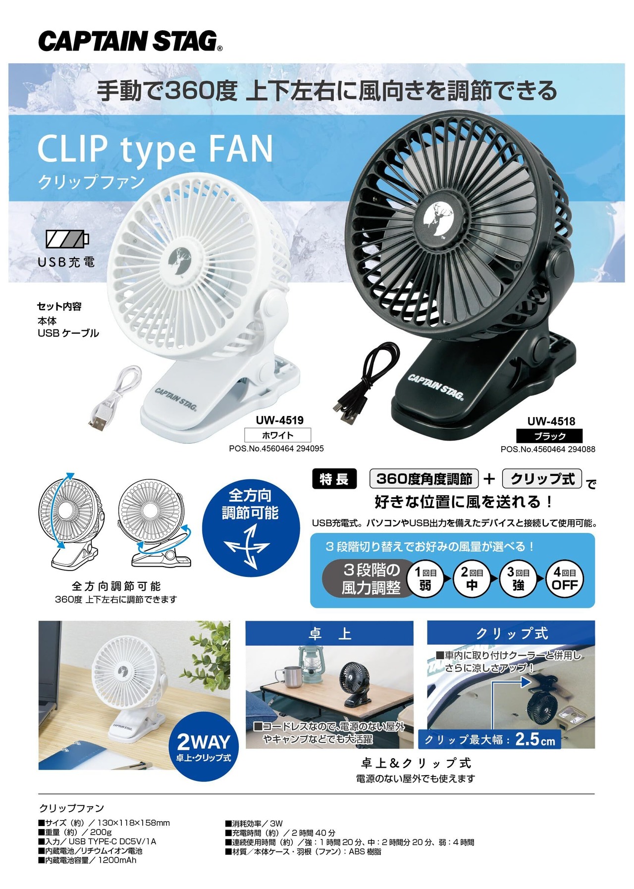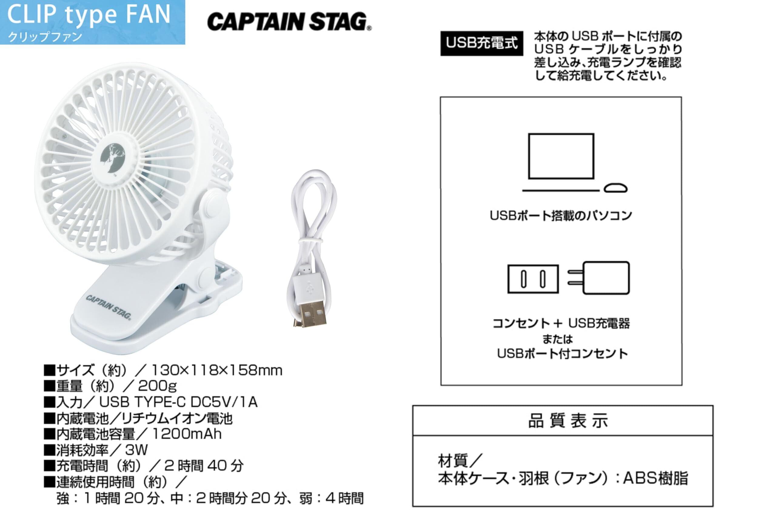 キャプテンスタッグ(CAPTAIN STAG) アウトドア 携帯扇風機 ハンディファン 3段階風力調節 USB充電式 静音 ブラック/ホワイト