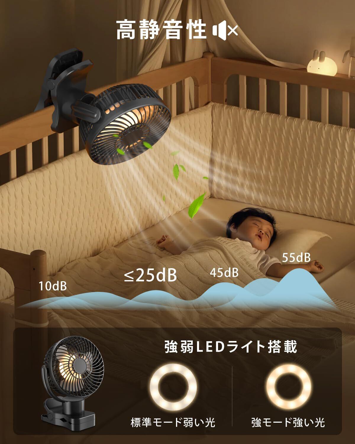 【LEDライト搭載&アロマ機能】クリップ& 卓上扇風機 柔らかな灯り(強・弱)のナイトライト機能を搭載しており、暗い場所でも目に優しく、寝室や夜間の授乳時にも最適です。さらに、専用のアロマボックスにお気に入りの香りや虫除けパッドを入れれば、風に乗ってほのかに香りが広がり、空間ごとリラックス空間に。虫が気になる夏の夜も、爽やかな香りと心地よい風で快適に。(※アロマオイルは別売り)風・光・香りの3つの要素で、快適な空間づくりをサポートし、毎日の暮らしにちょっとした贅沢をプラスしてくれます。