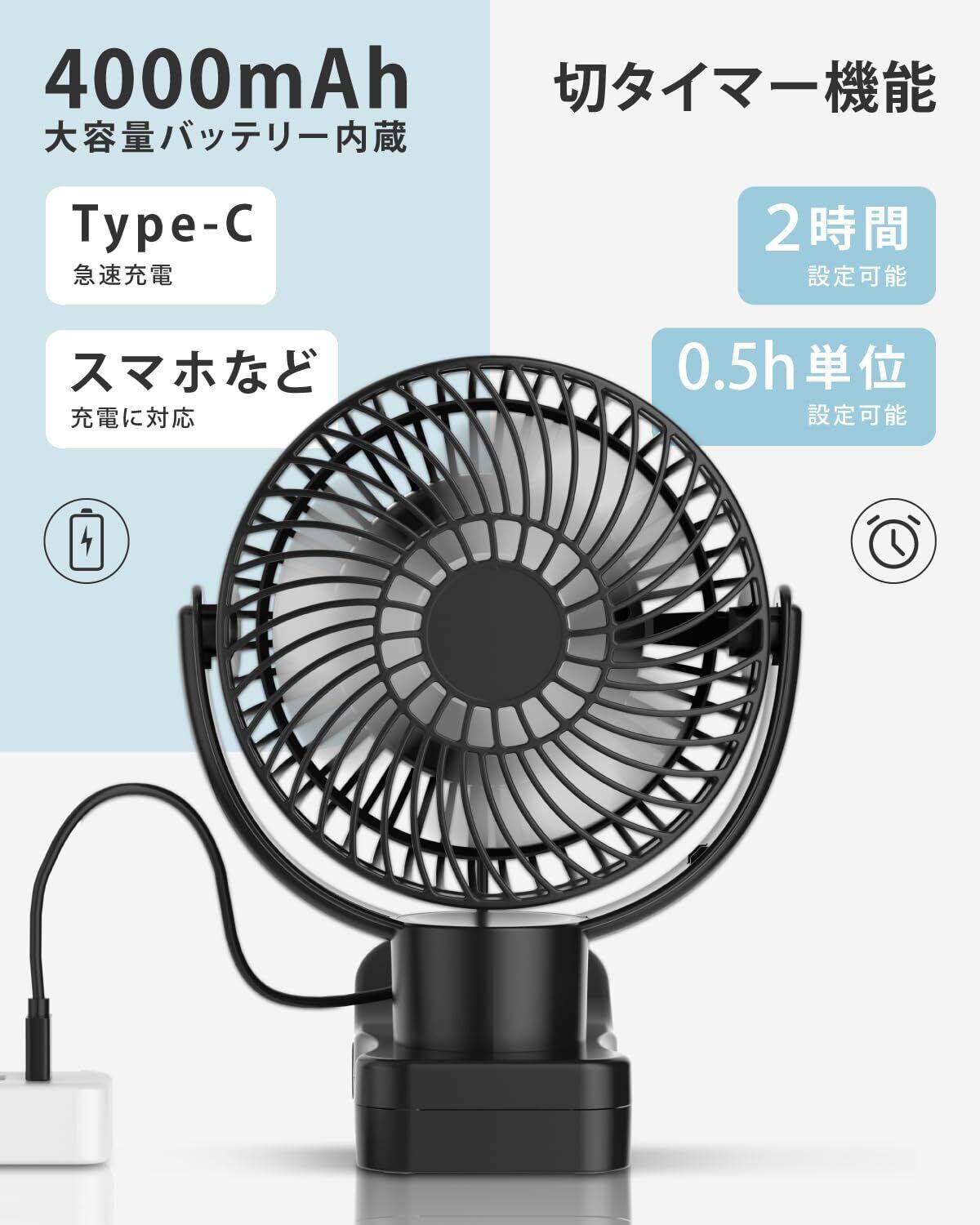 扇風機 クリップ 卓上 充電式 扇風機 360°自動首振り 風量4段階調節 リモコン付き 卓上・クリップ・吊下げの3Way タイマー機能 LEDライト 大容量バッテリー内蔵 TYPE-C急速充電 USBファン オフィス 車用 アウトドア 寝室 トイレ用 サーキュレーター【mochizukistore】(ブラック)