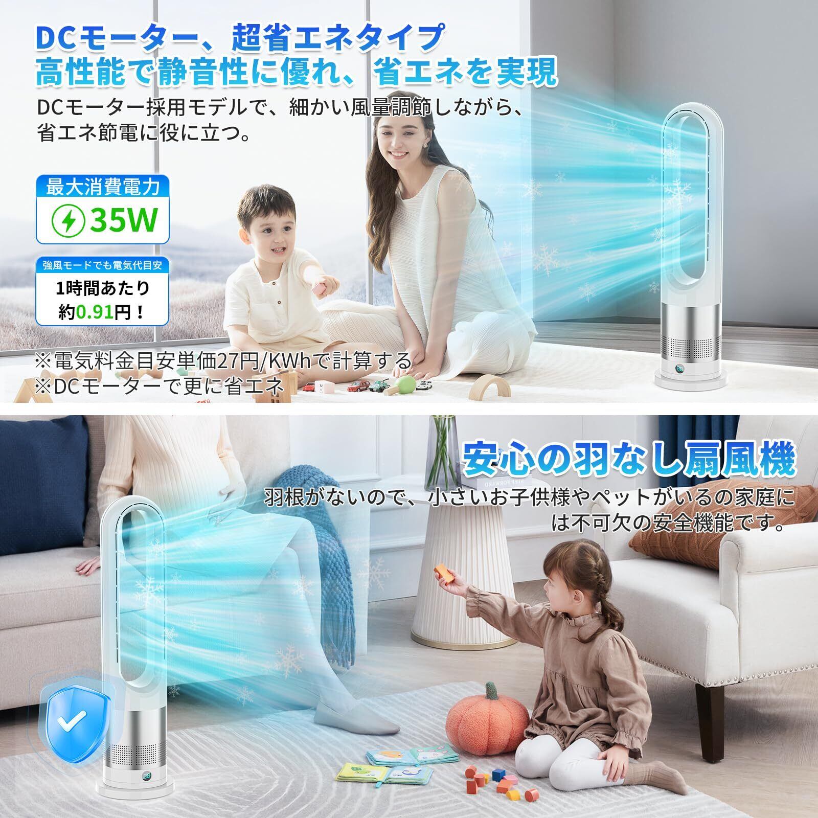 【夏向け・超省エネ設計な羽なし扇風機】の タワーファン は、スタイリッシュなデザインと、羽がないことによる安全性の高さです。通常の扇風機に比べると、スペースを取らず見た目もすっきり。扇風機 はDCモーター搭載して、ACモーター搭載より消費電力が少なく、電気代の節約に役立ちます。羽根なし扇風機 の強風モードでも1時間あたりの電気代は0.91円!超省エネ節電の羽根なし扇風機 です。