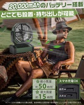 ❆彡【20000mAh充電池内蔵&夏のお出かけのお供に】20000mAhの超大容量リチウムイオンポリマー電池を内蔵しています。1回のフル充電で、最小風量で約50時間の連続使用ができます。最大風量でも約14時間の連続使用が可能です。使い方にもよりますが、1日中屋外にいても充電なしで利用できることが多く、モバイルバッテリーを持ち歩く必要がありません。そのため、荷物を減らすこともできます。※ファンのみを稼働させた際の時間。使用時間は充電状態や使用環境によって異なる場合があります。