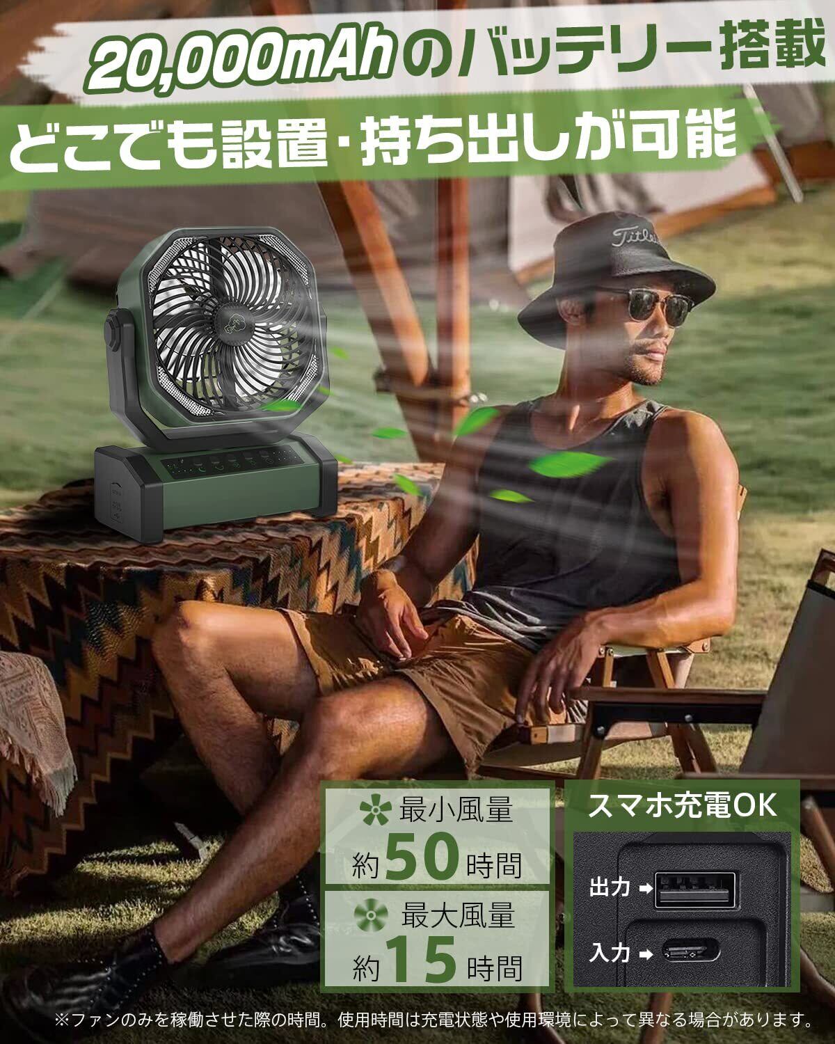 【多機能ファン&20000mAh充電池内蔵】 キャンプ扇風機 アウトドア扇風機 左右自動首振り 充電式 サーキュレーター 2重反転ファン ポータブル リモコン付き タイマー 風量4段階調節 LEDライト 吊り下げ コードレス パワフル送風 最大約50時間連続使用 防災 キャンプ 車中泊 グリーン | KSショップ