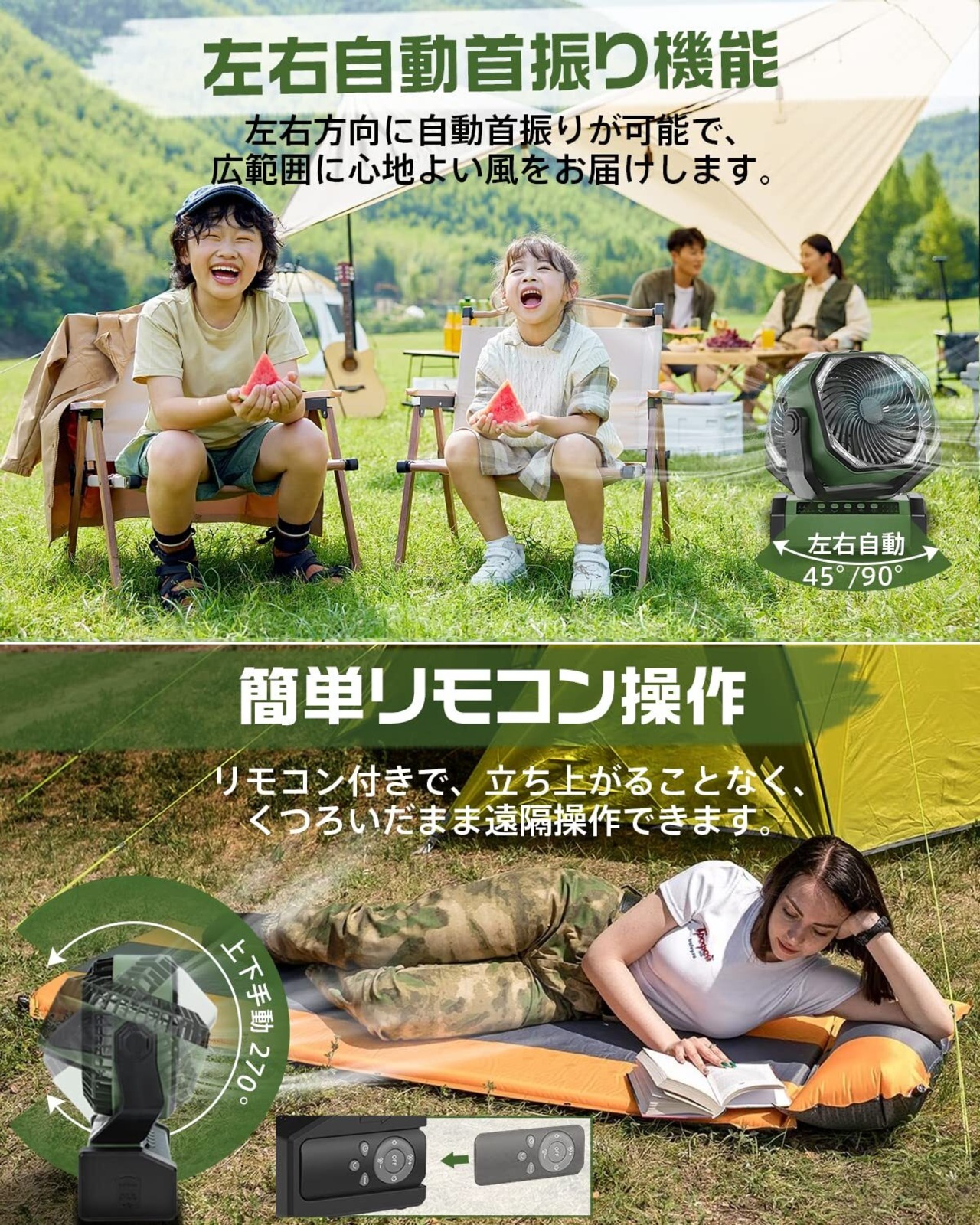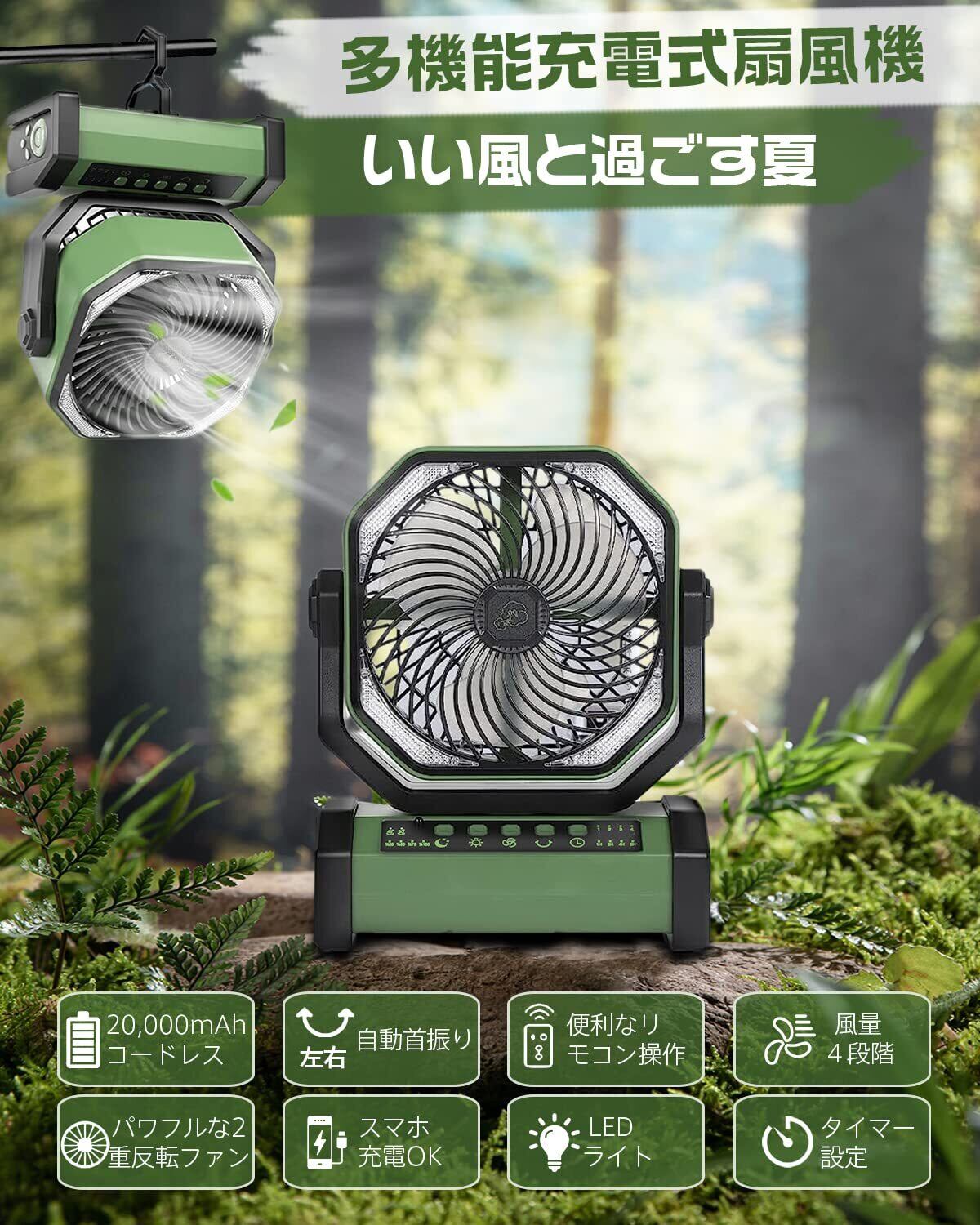 【多機能ファン&20000mAh充電池内蔵】 キャンプ扇風機 アウトドア扇風機 左右自動首振り 充電式 サーキュレーター 2重反転ファン ポータブル リモコン付き タイマー 風量4段階調節 LEDライト 吊り下げ コードレス パワフル送風 最大約50時間連続使用 防災 キャンプ 車中泊 グリーン