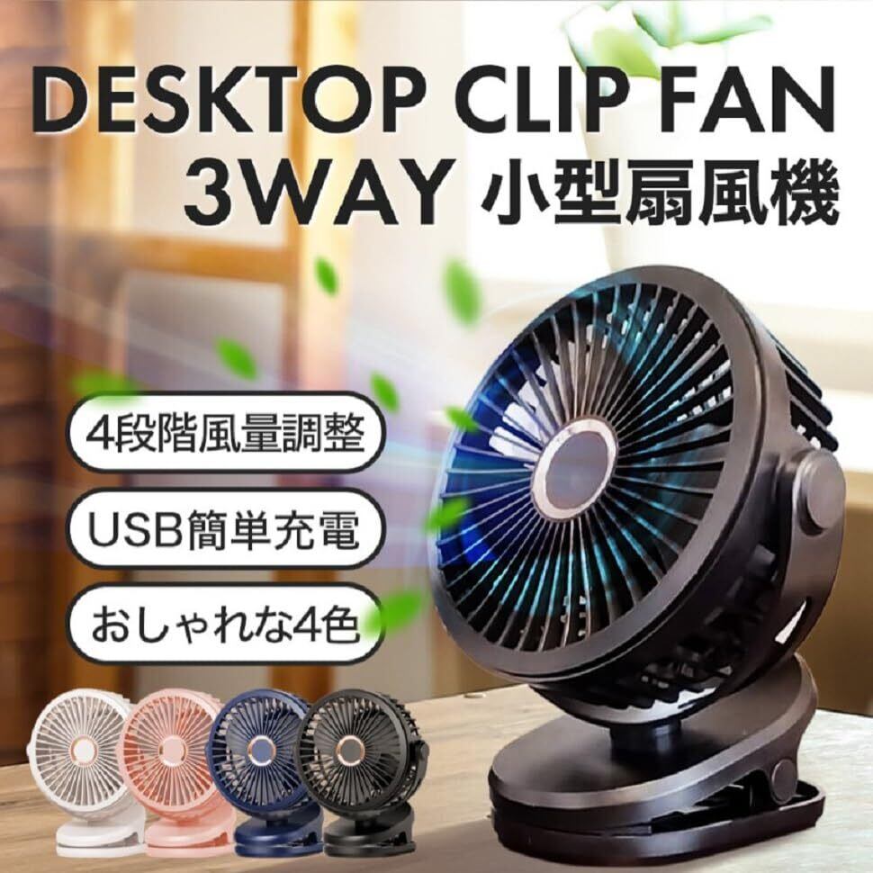 【3Way 小型 卓上扇風機】クリップで挟む、壁にかける、そのまま置くの3通りの使い方。アウトドアはもちろん日常生活でも便利に使える3Way小型卓上扇風機です。