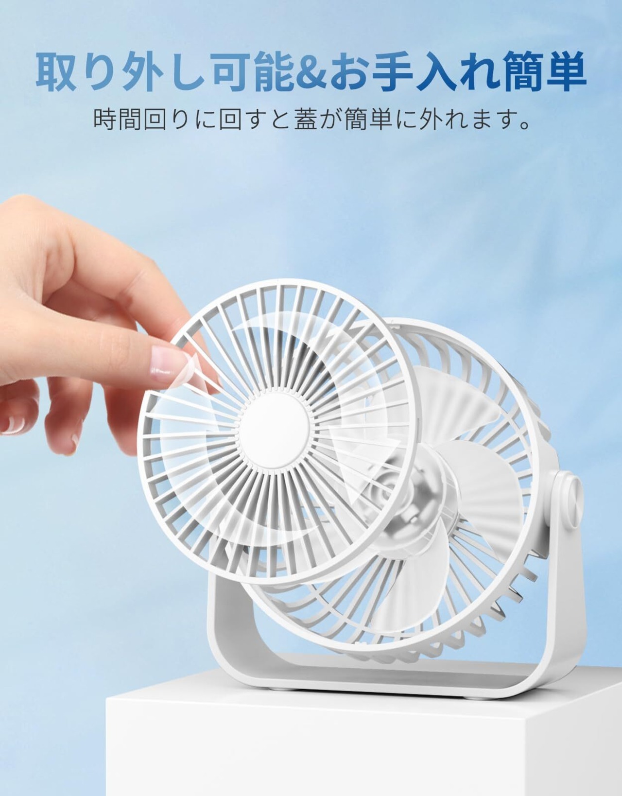 【お手入れが簡単】特別な工具は不要で、扇風機の前カバーを時間回りに回すと簡単に取り外し、水洗いが可能で、汚れた扇風機の羽根を湿った布で拭くこともできます。この卓上ファンは優れたABS樹脂を採用して、衝撃、高温に強く、耐久性が抜群です。滑り止めベースで安定性を確保します