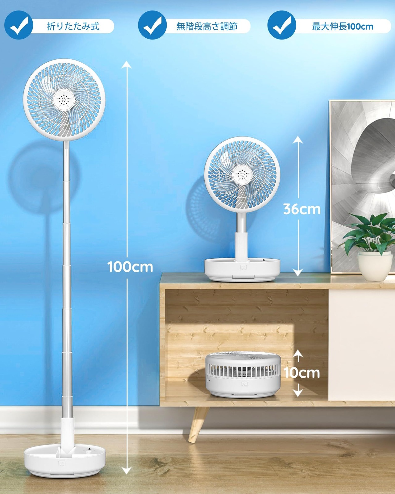 【折りたたみ式&伸縮自由】高さ36~100cmまで自由調節可能折りたたみ扇風機。デスク、ベッドサイド、脱衣所など、シーンに合わせて最適な高さに調整できます。完全に折りたたむとわずか20×10cmのコンパクトサイズ、オフシーズンなどご使用にならない時引き出しやバッグにすっきり収納でき、従来の大型扇風機の置き場所問題を解決!室内外兼用で、アウトドアやキャンプにも最適。軽量設計で持ち運び便利、いつでもどこでも涼やかな風を楽しめます。