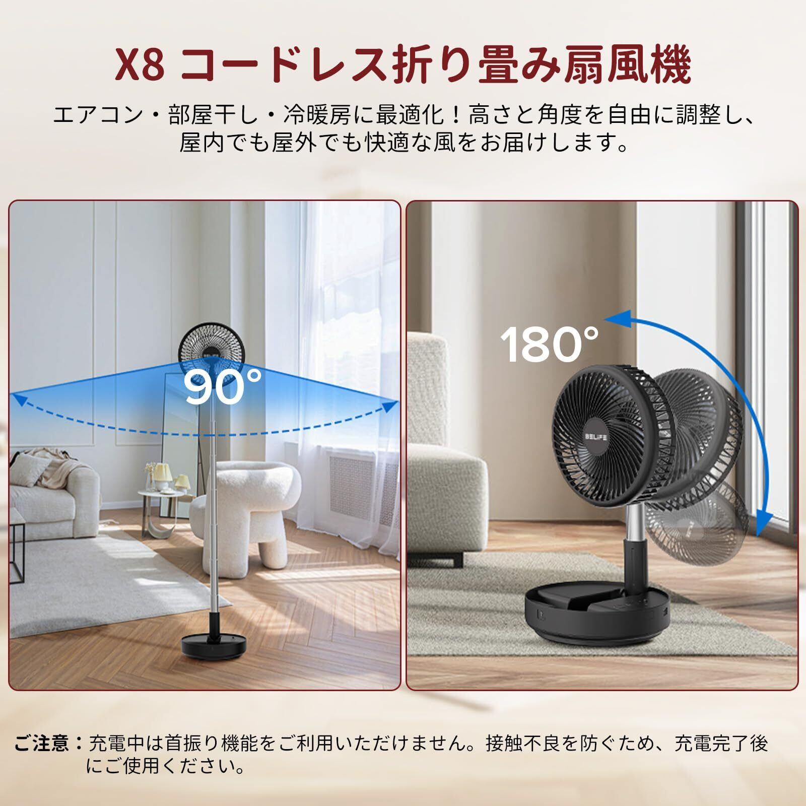 【2025節電暑さ対策 自動首振り】Belife X8 折りたたみ 充電式扇風機 コードレス 静音DCモーター 卓上 小型 サーキュレーター リモコン付き 4段階風量調節 伸縮式 高さ自由調節 コンパクト収納 7200mAh電池 アウトドア 室内 リビング 寝室 キャンプ対応 換気/空気循環/部屋干し/衣類乾燥 (黒)