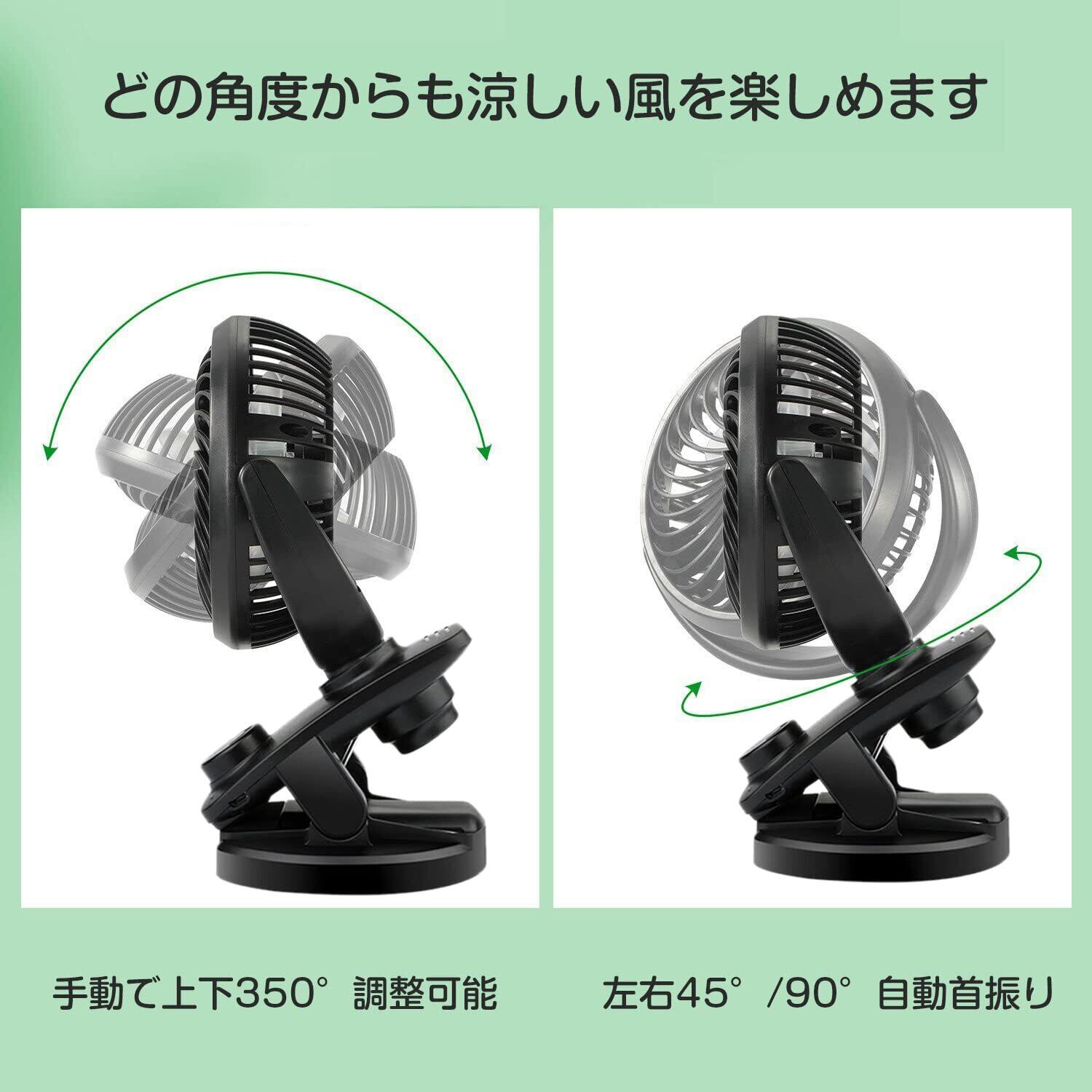 【手動350°回転&自動左右90°首振り】手動で上下350°調整可能なので、どの角度からも涼しい風を楽しめます。自動首振りボタンを押しすると、クリップ扇風機が左右45°/90°自動的に首振りします。ずっと同じ方向から風ではないので、肌に優しく気持ちよく感じることでしょう。また、手動で左右、上下を350度まで角度調整もできて、使い方次第で広範囲に送風できます。部屋の空気をさせるのも大変適しています。
