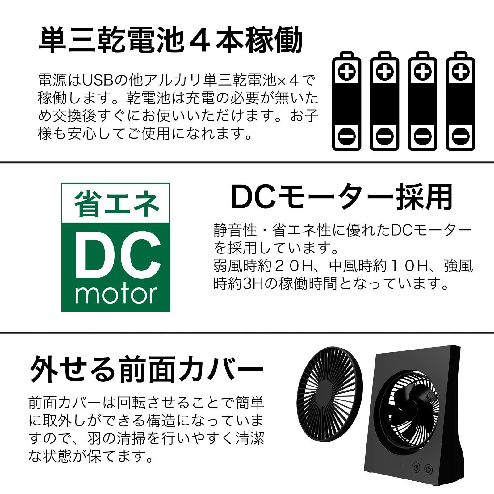 【DCモーター採用】静音性・省エネ性に優れたDCモーターを採用しています。新品の乾電池ご使用時、弱風約20時間、中風約10時間、強風約3時間の稼働時間となっています。