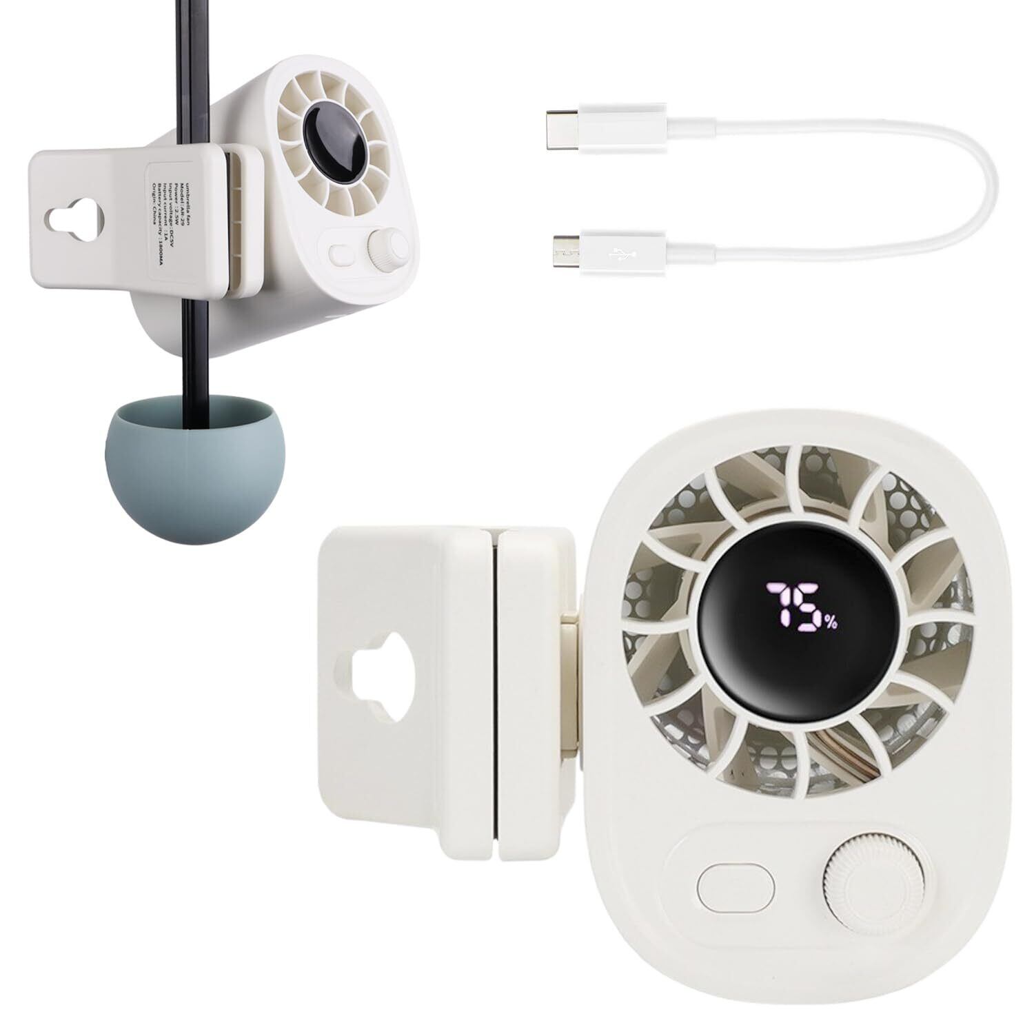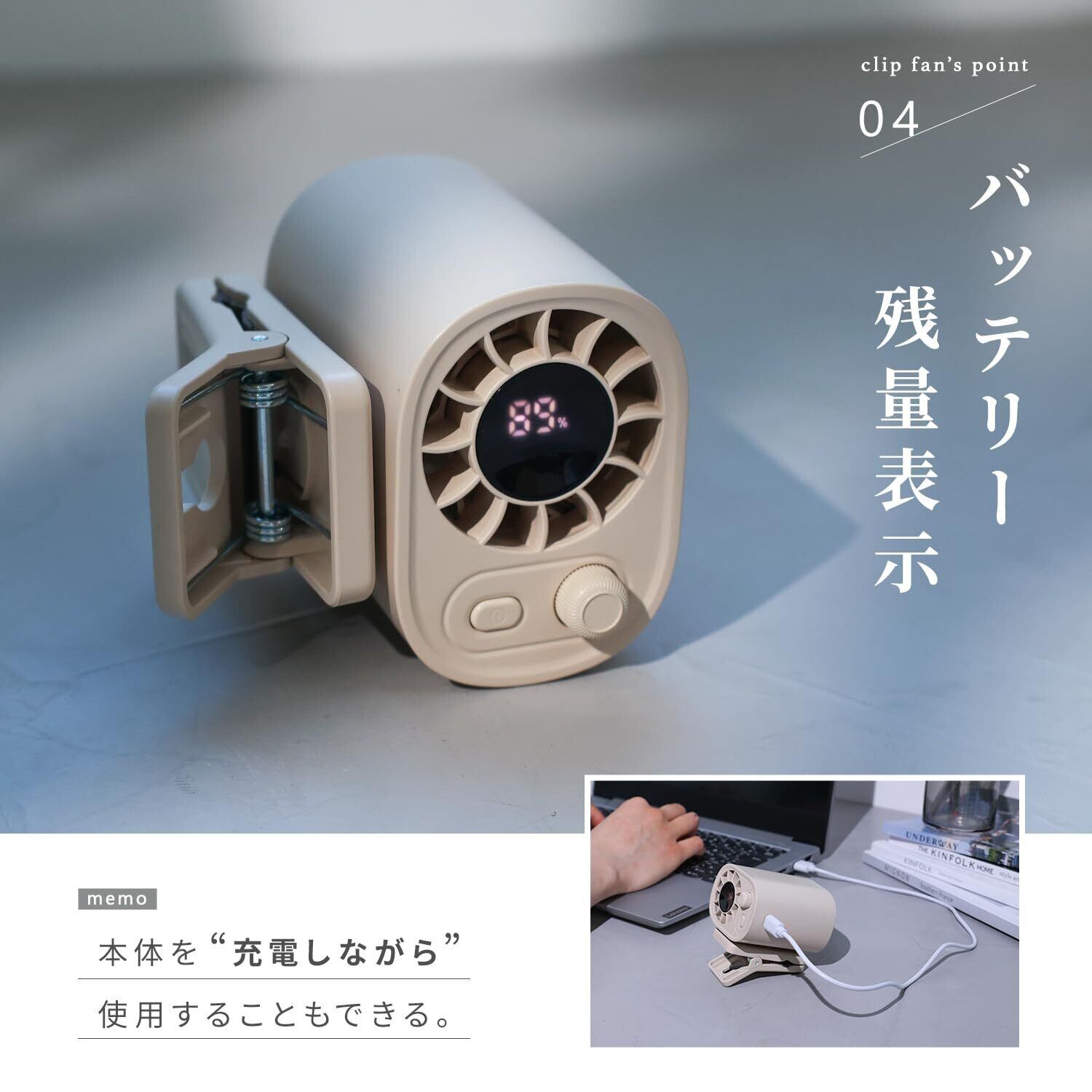 【仕様】360度回転、風力100段階調整可能、入力電力:DC5V、入力電流:1A、電力:2.5W、充電時間:2.3時間、持続時間:(1段階)約5時間、(25段階)約4時間、(50段階)約3時間、(75段階)約2.2時間、(100段階)約2時間、バッテリー:1800mAh【サイズ】縦6.3×横8×奥行き6.5cm、クリップ幅:2.5cm、重量:123g【素材】ABS+PC【商品内容】本体、取扱説明書、充電ケーブル