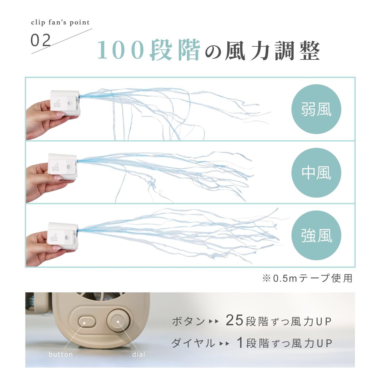 【シーンに合わせた風を、自由にコントロール】 風の強さは100段階で調整可能。やさしい風で赤ちゃんにも安心、暑さが厳しい日にはしっかりとした涼しさを提供します。さらに、クリップで固定したまま角度調整ができるので、顔や首などピンポイントに風を当てられ、日傘でも卓上でも自在に使えます。