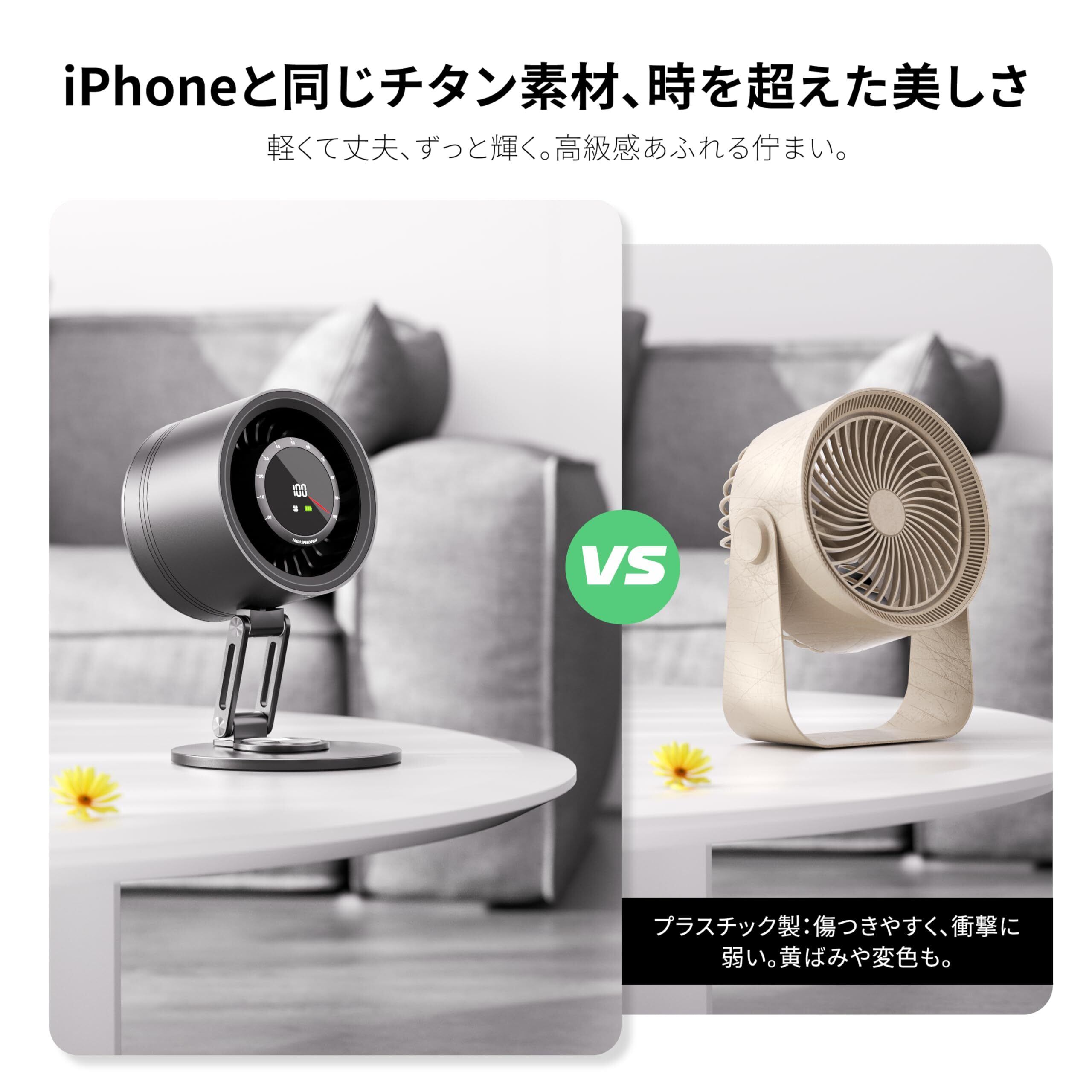 【世界初!チタン金属製サーキュレーター】i-Phoneと同じ航空グレード5チタン合金を用いたフルメタルボディで、軽量かつ頑丈で耐久性に優れ、高級感を放ちます。製品重量はわずか 1248g、寸法は約(179mm×145mm×171mm〜242mm)で、家庭での使用はもちろん、外出時の持ち運びにも負担がありません。フルメタルボディは汚れや指紋がつきにくく、軽く拭くだけで新品のような輝きを取り戻せます。デザイン性と実用性を兼ね備えた、新世代の扇風機の傑作です。