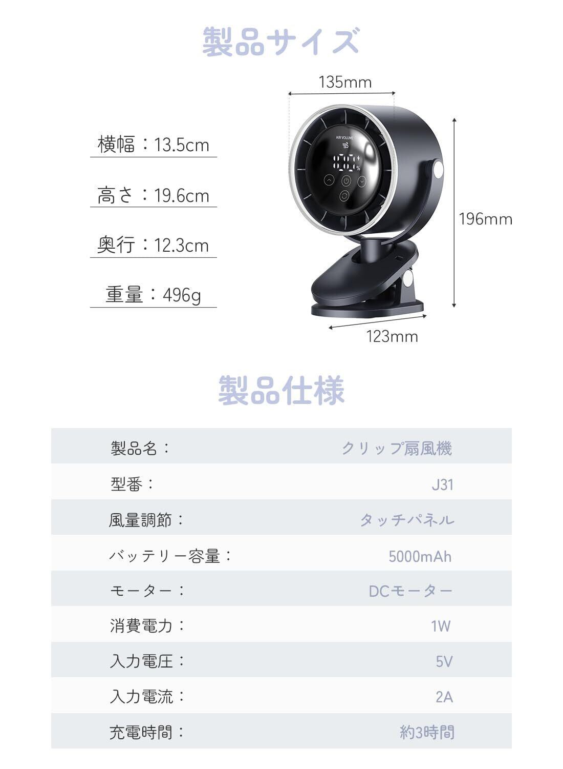 ✨【100段階の風量・究極涼感】猛暑対策の決定版、100段超高速風USBクリップ扇風機が登場!超精密ブラシレスモーターによる100段階の風量調節を実現し、たった3秒で-16°Cの体感効果を提供。科学的な涼感を体感できます。大画面デジタル表示で風量とバッテリー残量を一目で確認できる便利さが魅力です。卓上、クリップ、壁掛け、3役をこなす多機能デザインです。