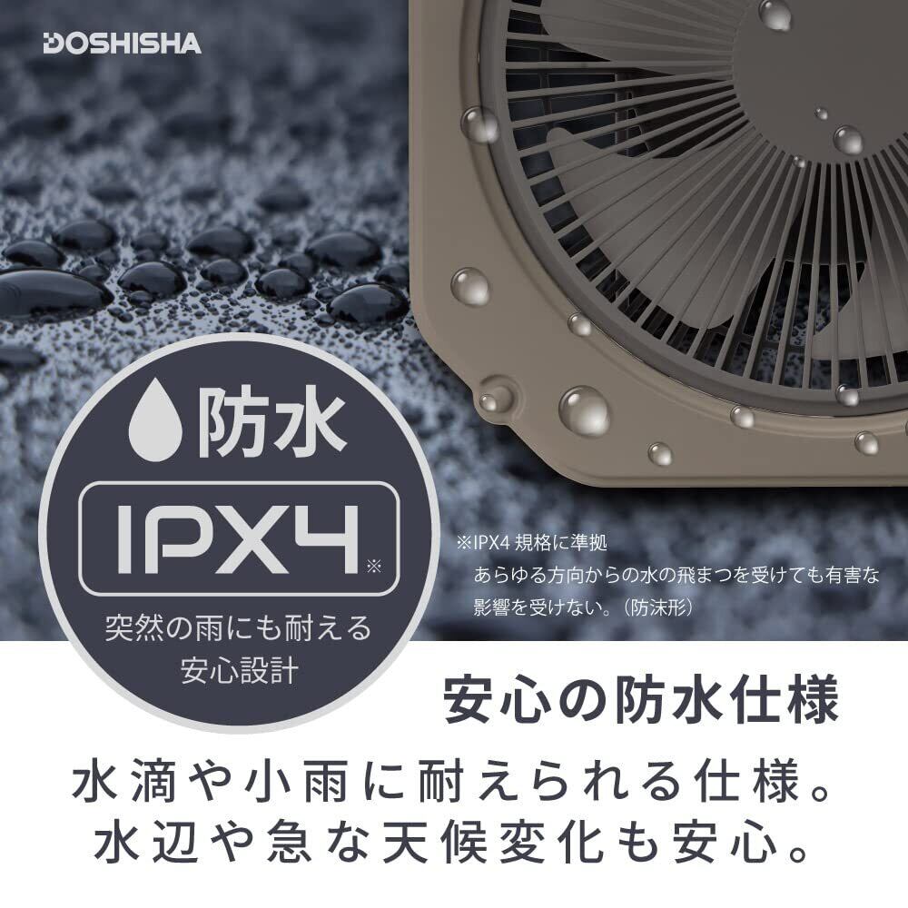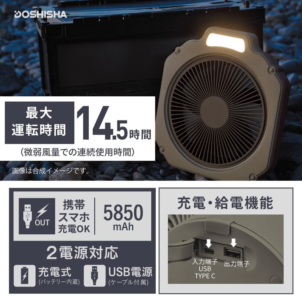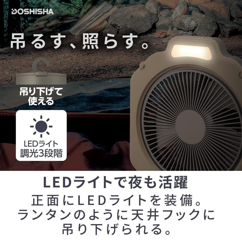 【アウトドアに最適】 ドウシシャ WindGEAR 扇風機 アウトドア向け 20㎝ LEDライト付 防水機能(IPX4) 2電源対応(充電式・USB電源) 風量4段階 収納袋付 ブラウン