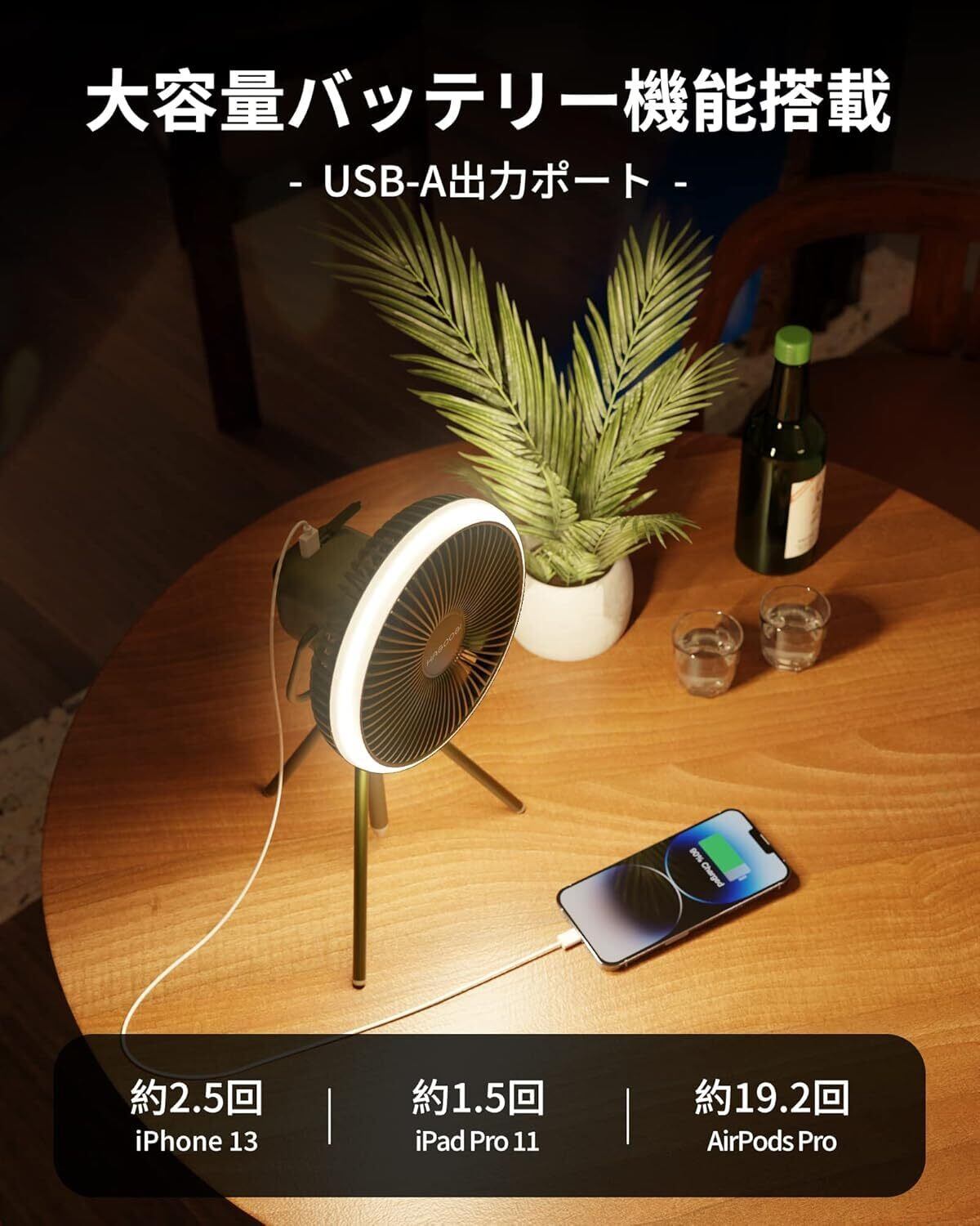【超音波方式で蚊を撃退】 HAGOOGI キャンプ 扇風機 コードレス 10000mAh モバイルバッテリー 自動首振り LEDライト リモコン 付き 多機能 アウトドア 吊り上げ ファン 長時間連続使用 卓上 充電式 扇風機 風量調節 リズム風 静音 キャンプ用品 グリーン | KSショップ