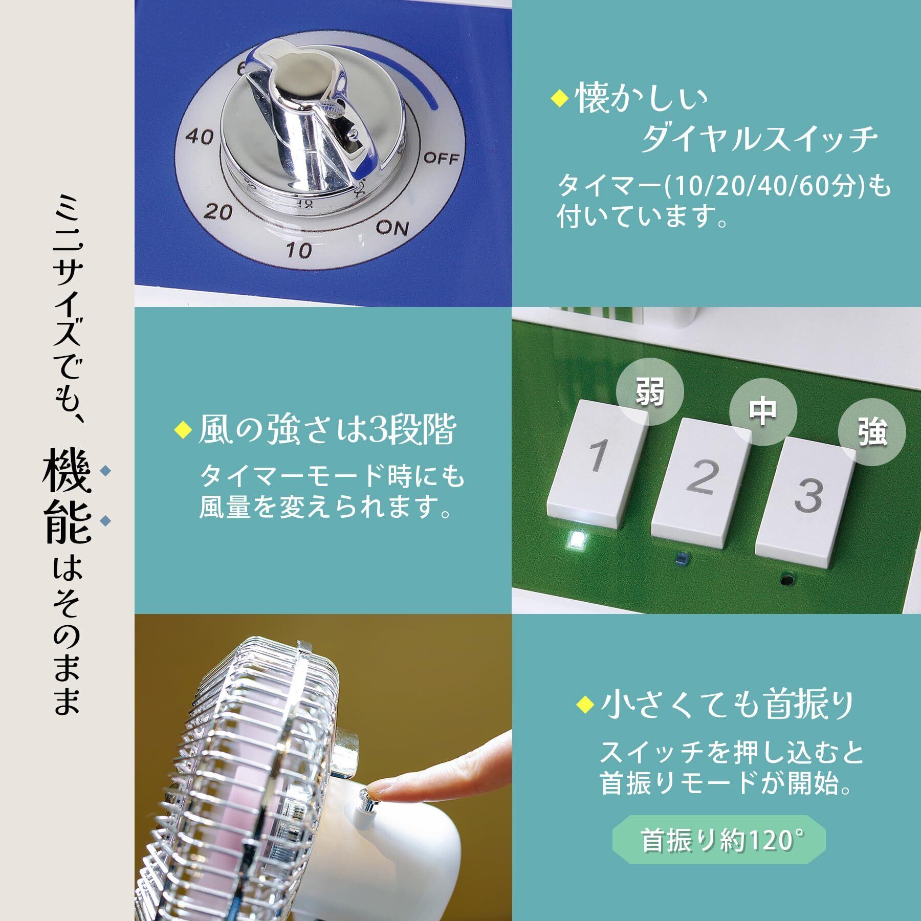首振りもタイマーも、そのままミニサイズ。懐かしい「昭和レトロ」な扇風機