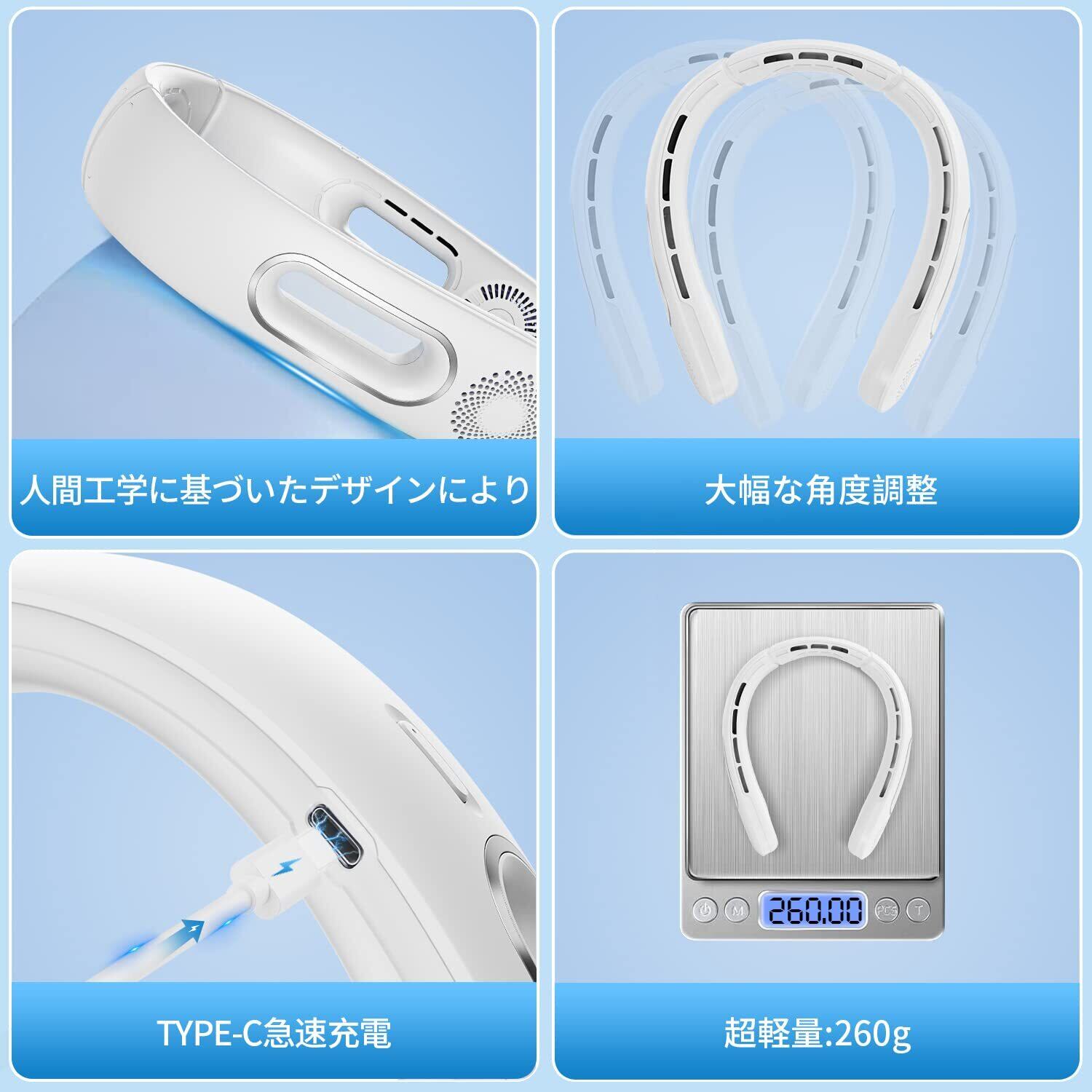 首掛け扇風機 携帯扇風機 5200mAh容量バッテリー 長時間使用 軽量 熱中症対策 遠足/スポーツ観戦/通勤/通学などに適用(ホワイト(