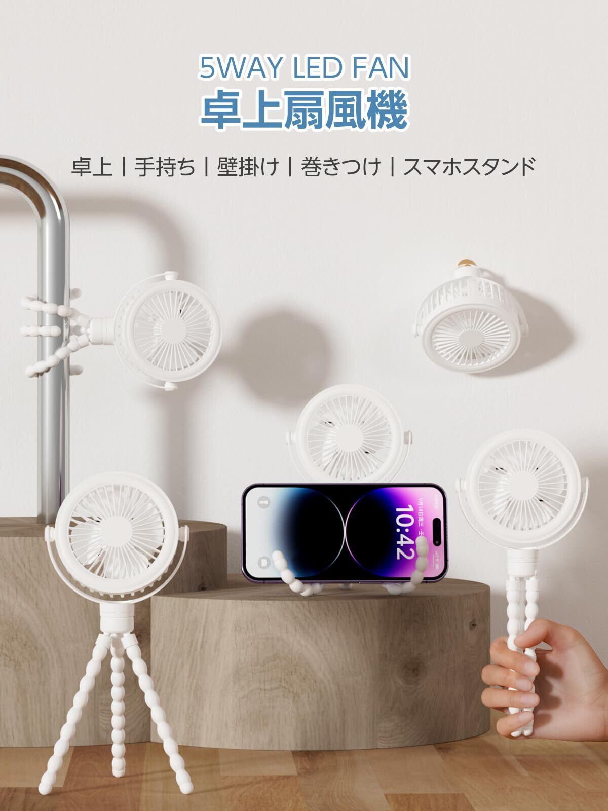 【弥生日和】 卓上扇風機 360度角度調整 くねくね USB扇風機 三脚タイプ 小型 5WAY 卓上/吊り下げ/手持ち/巻き付け/スマホスタンド LEDライト搭載 風量3段階調整 携帯扇風機 取り外し可能な三脚 USB充電式 軽量 車 アウトドア 暑さ対策 キャンプ ハンディファン