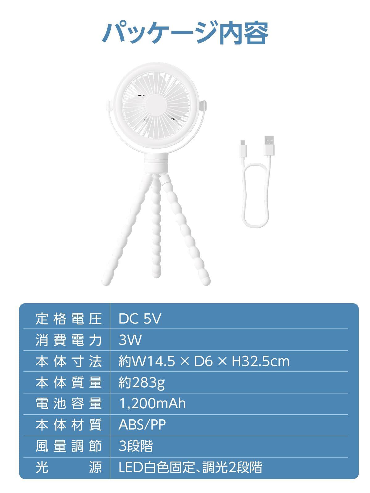 【商品仕様&安心】定格電圧:DC 5V・消費電力:3W・本体寸法:約W14.5 × D6 × H32.5 cm・本体質量:約283g・電池容量:1200mAh・材質:ABS/PP・光源:LED白色固定、調光2段階・パッケージ内容:扇風機本体×1、USBケーブル×1、日本語取扱説明書×1 ※安心:ご購入の商品について何かご不明の点がございましたら、また初期不良があった場合は、遠慮なくお問い合わせください。速やかに対処させていただきます。