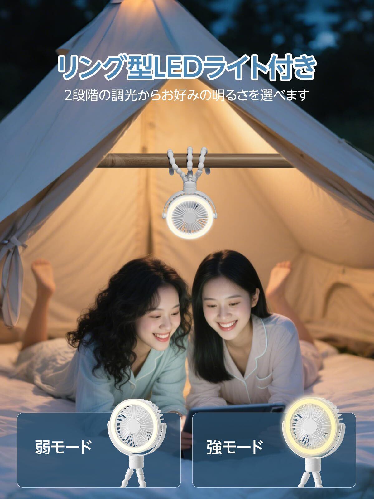 【LEDライト付き|暗い場所でも活躍するUSB充電式】携帯扇風機はリング型LEDライトを搭載し、2段階の明るさ調節が可能で、暖色の柔らかな光が周囲を優しく照らします。キャンプ、夜間の外出や停電時でも安心です。USB充電式なので、パソコンやモバイルバッテリー、ACアダプターから手軽に充電でき、いつでもどこでも使用できます。