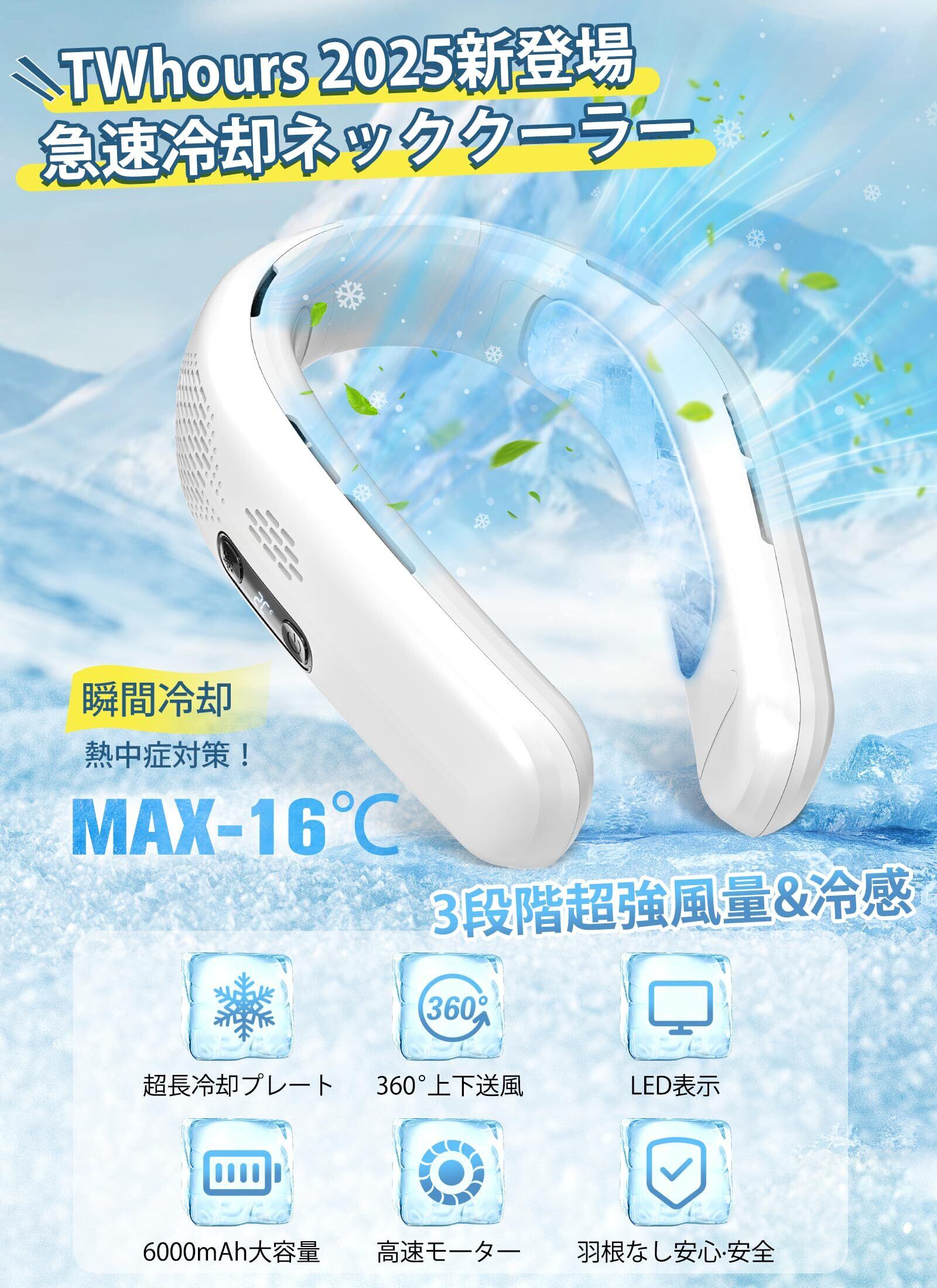 TWhours 首掛け扇風機 冷却プレート 【2025年夏新型・3段階風量&冷感調節・超長冷感プレート】瞬間冷却ネッククーラー 首掛けクーラー -16℃体感温度ダウン U型ネックファン LEDディスプレイ表示 Type-C充電 6000mAh大容量 6つの大型送風口 羽なし 上下送風 自由に調節可能 軽量 持ち運び便利 熱中症対策 父の日/母の日/誕生日 プレゼント ギフト (ホワイト)