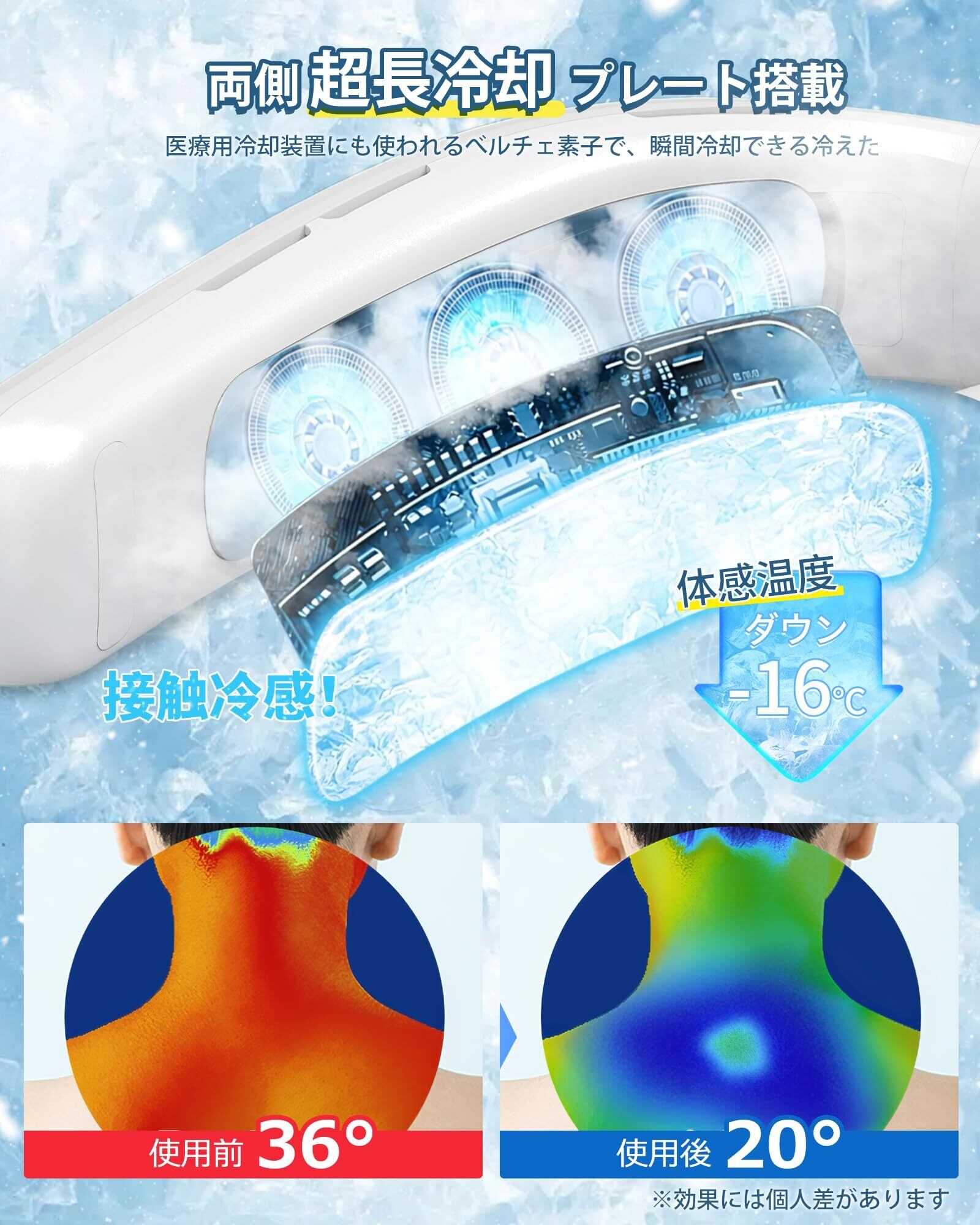 【瞬間冷却ネックファン&2025年夏新世代の冷却グッズ】新たに冷却機能を搭載した2025年最新の首掛けクーラー!製首かけ扇風機は独自設計によって高性能ダブルタービン&高風量静音ファンを採用、大風量を保ちながら静音運転を実現しました。新しいトレンドを導く半導体熱技術を採用し、上向きのファンで首周りや顔、首の裏などを立体的に冷却、首を効率よく冷やすことにより、1秒で肌に冷たさを伝え、体感温度が16℃下がります。暑い夏の日でもすぐに体温を下げ、快適な涼しさを提供する ネッククーラーです!夏の蒸し暑さを解消します。