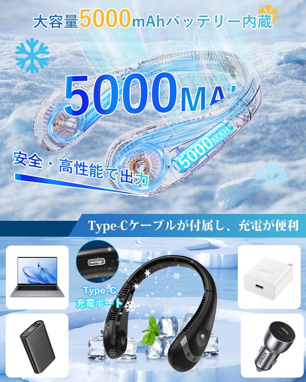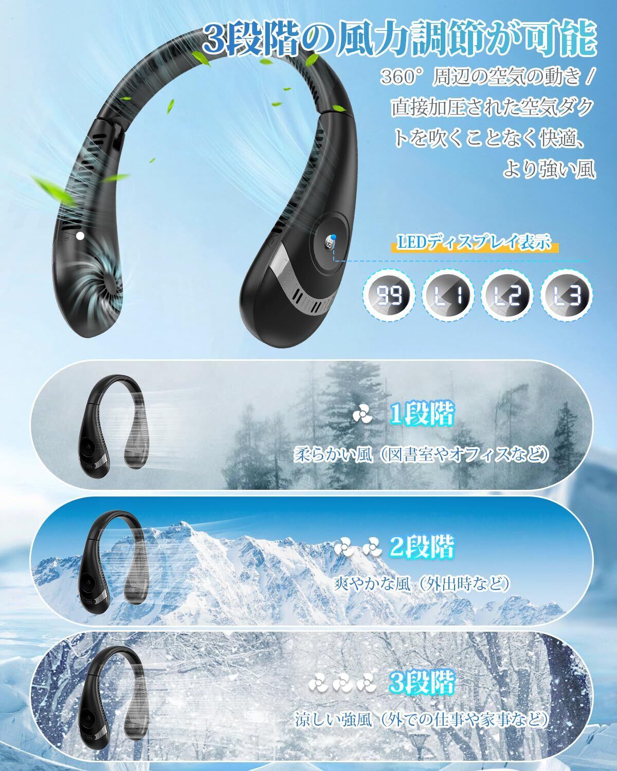 【ノイズが低い&3段階調整】独立したボタンで簡単に切り替えることができます、低/中/高速を含むもの。両側のツインタービンとツインダクトからのベニフィット。ネックファンは非常に低いノイズを生成します、より静かな冷却を楽しむことができます。
