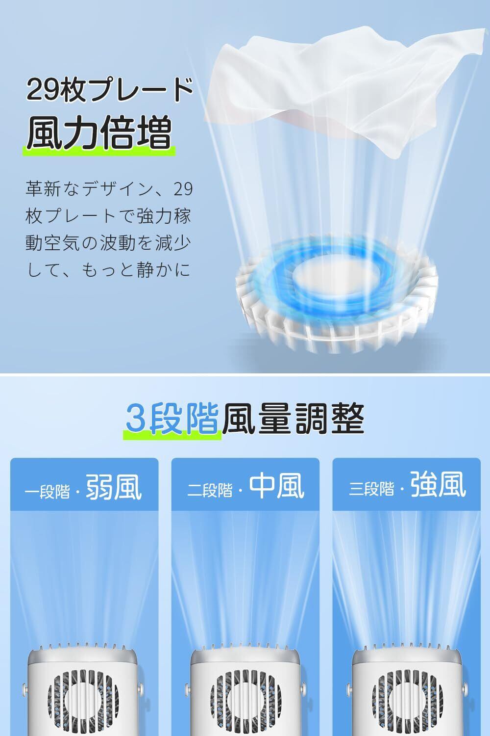 【3段階風量調節&静音かつ強風】ワンボタンで簡単に風力を弱風>中風>強風の順で切り替えることができます。ハンズフリー扇風機暑さやお好みによって自由に風量が調節できますし、電力の無駄消費も抑えられます。ブラシレスモーターの安定性に加えて、強力な風量を確保しながらも回転音が気にならないです。 オフィスなど静かな環境でもストレスなく快適に使用でき、静かで優しい風を感じながら、より仕事や勉強に集中できます。