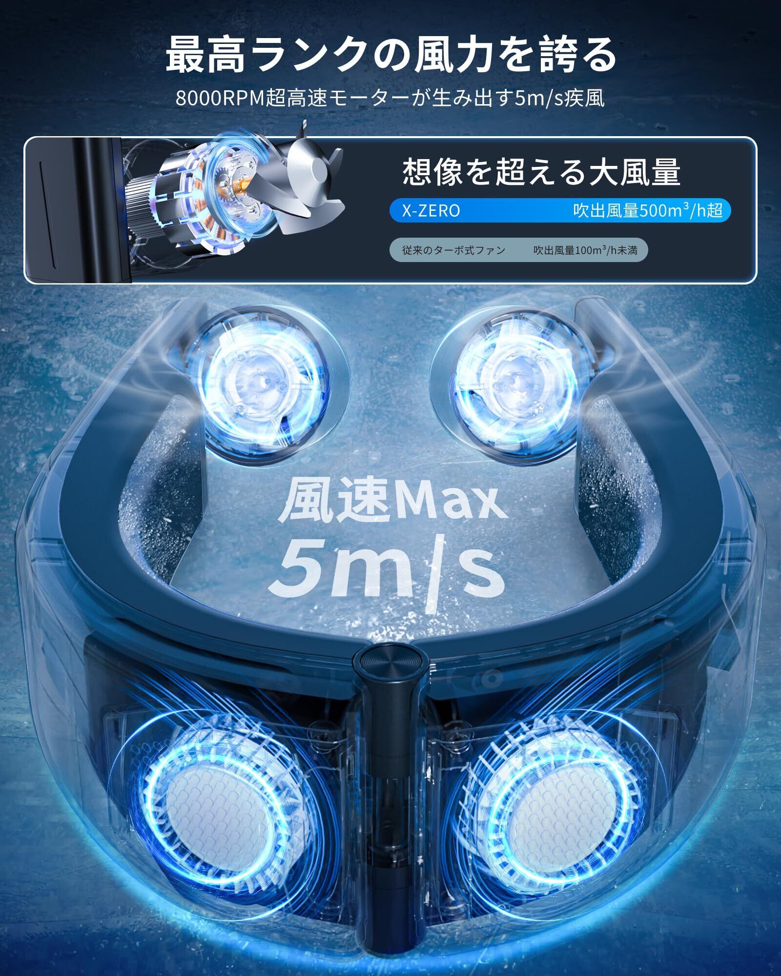 【5m/s強力送風・180°角度調整可能】優れた冷却機能に加え、8000RPM高速モーターでかつてない500m³/h超の風量を送り出します。左右二つの強力ファンはそれぞれ180°角度調整でき、頬・首筋・顎下の三点冷却を実現。風流とペルチェのハイブリッド冷却システムで頸動脈を冷やし、冷えた血液で全身クールダウン