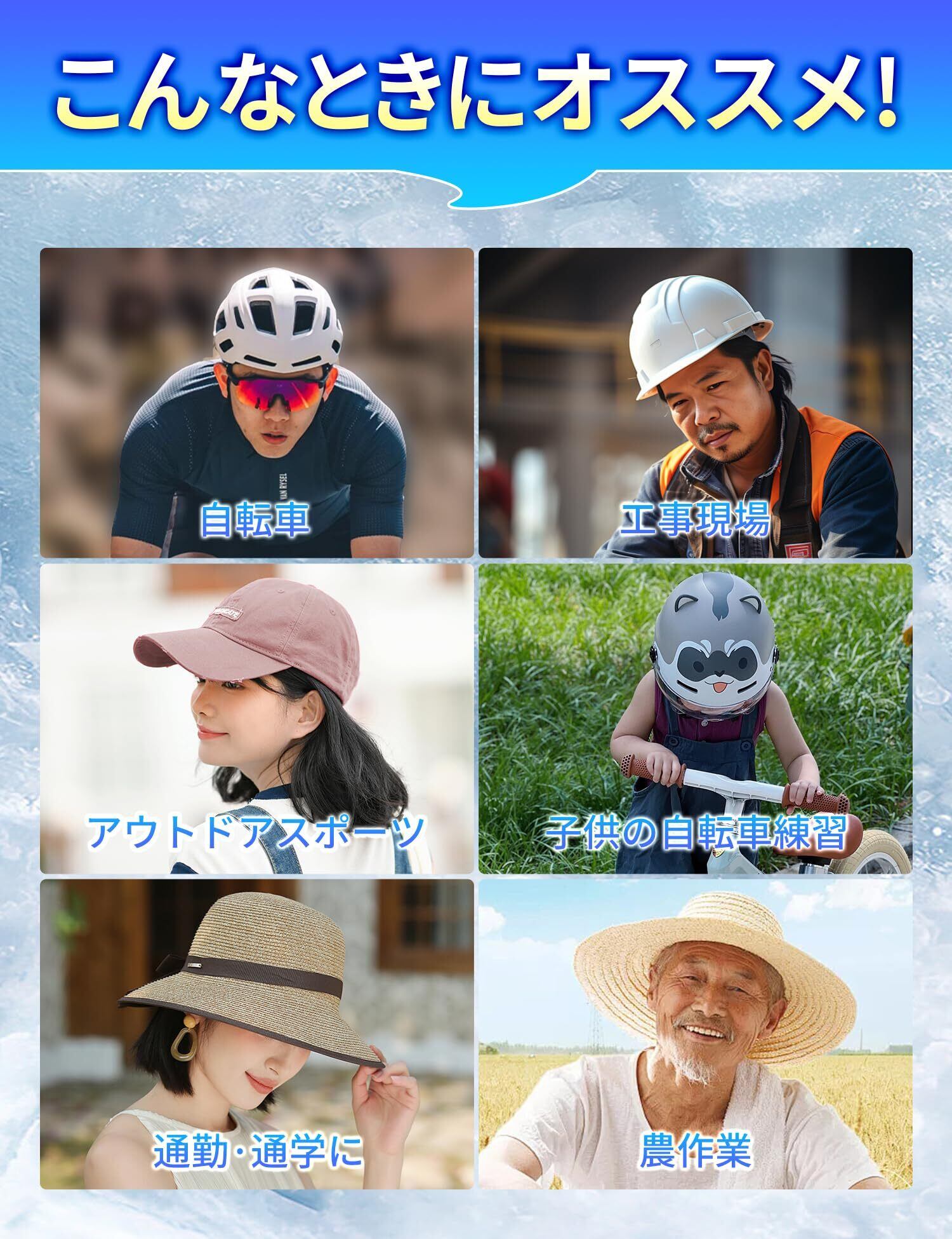 【用途が幅広く、様々なシーンでお使いいただけます】このアイスヘルメットライナーは猛暑の日には外出にも必要なアイテムです。自転車、 ランニング、 園芸、 農作業 、工事現場、登山、 花火大会 、釣り、通勤、通学、スポーツ観戦など様々なアウトドア活動に適用されます。長時間立ち続ける必要がある方や、高温の場所に立つ必要がある方に最適です。外出先やアウトドア用品(保冷剤)としても活躍します。