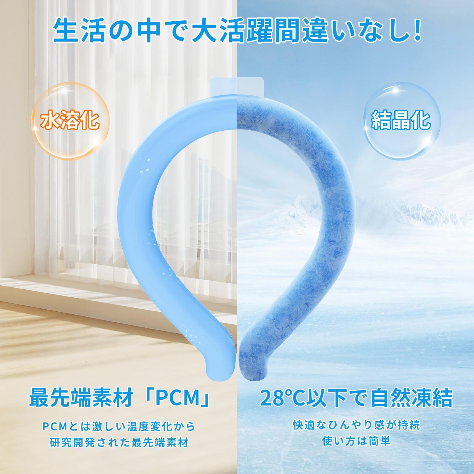 【繰り返し使用&冷感が長時間続く】:このクールネックリングはバッテリーや充電器不要!凍結は28°C未満のどこからでも始まります。この冷却チューブは28℃以上になると液体化・28℃以下になると個体へ変化・冷やせば繰り返し何度でも使用可能です。このアイスネックリングはひんやり感が長時間持続し、夏の間ずっとお使いいただけます。