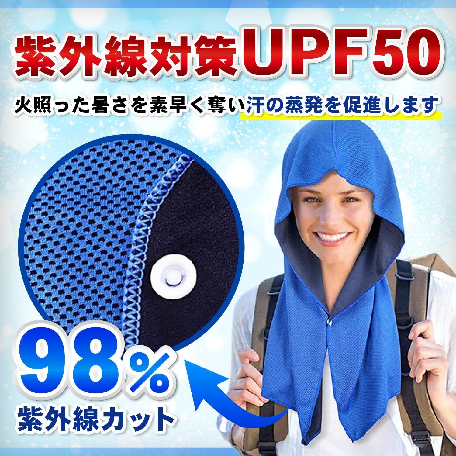 頭を冷やすだけではなく、紫外線対策としても、UVカット(UPF50)で肌を守り、日焼けをブロックする、蒸れにいクールタオルです。ボタン付きで安定感もあり、頭から首、顔まで冷やし日差しのシャットアウトする、uvカットタオルです。