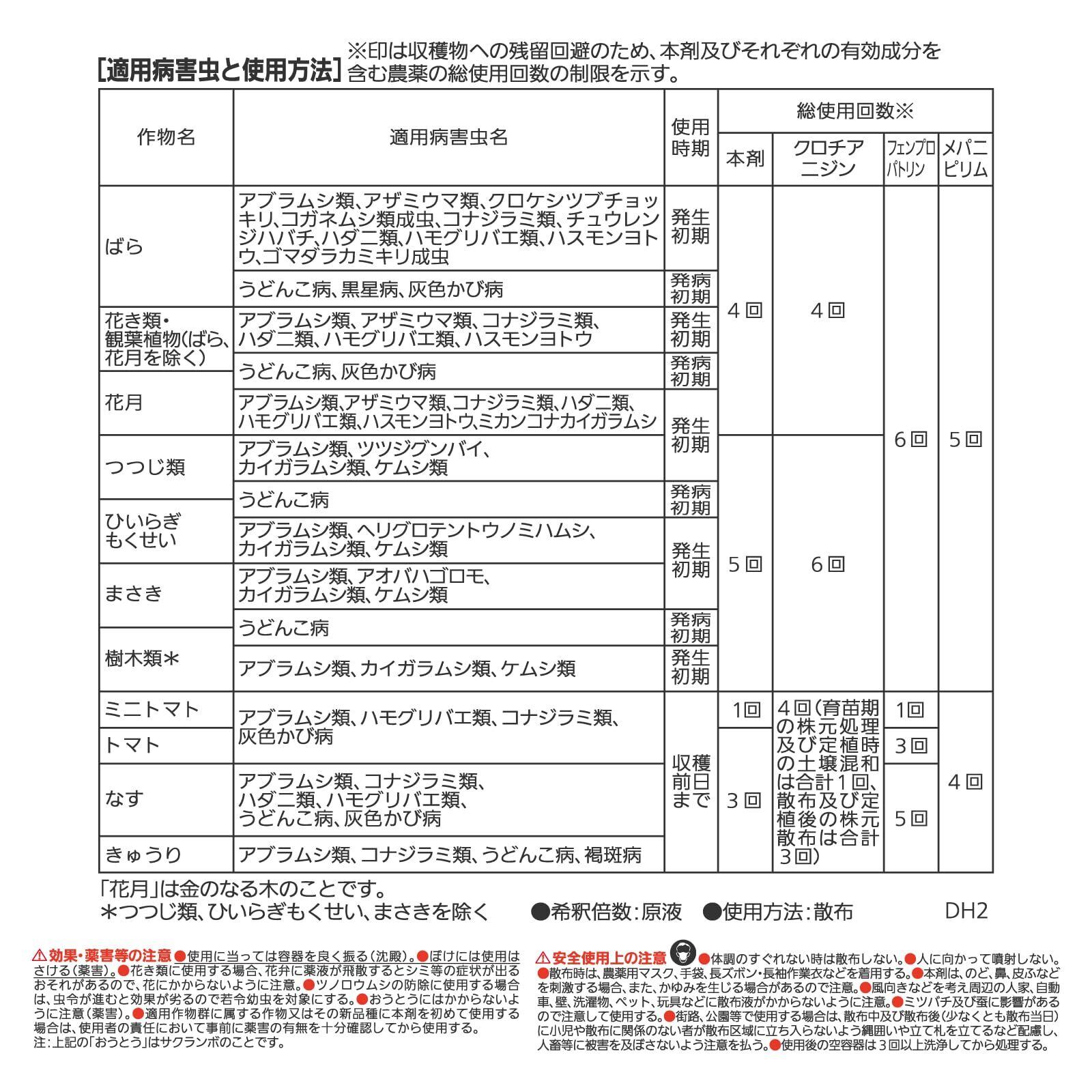 ※花き類に使用する場合、花弁に薬液が飛散するとシミ等の症状が出るおそれがあるので、花にかからないように注意してください。